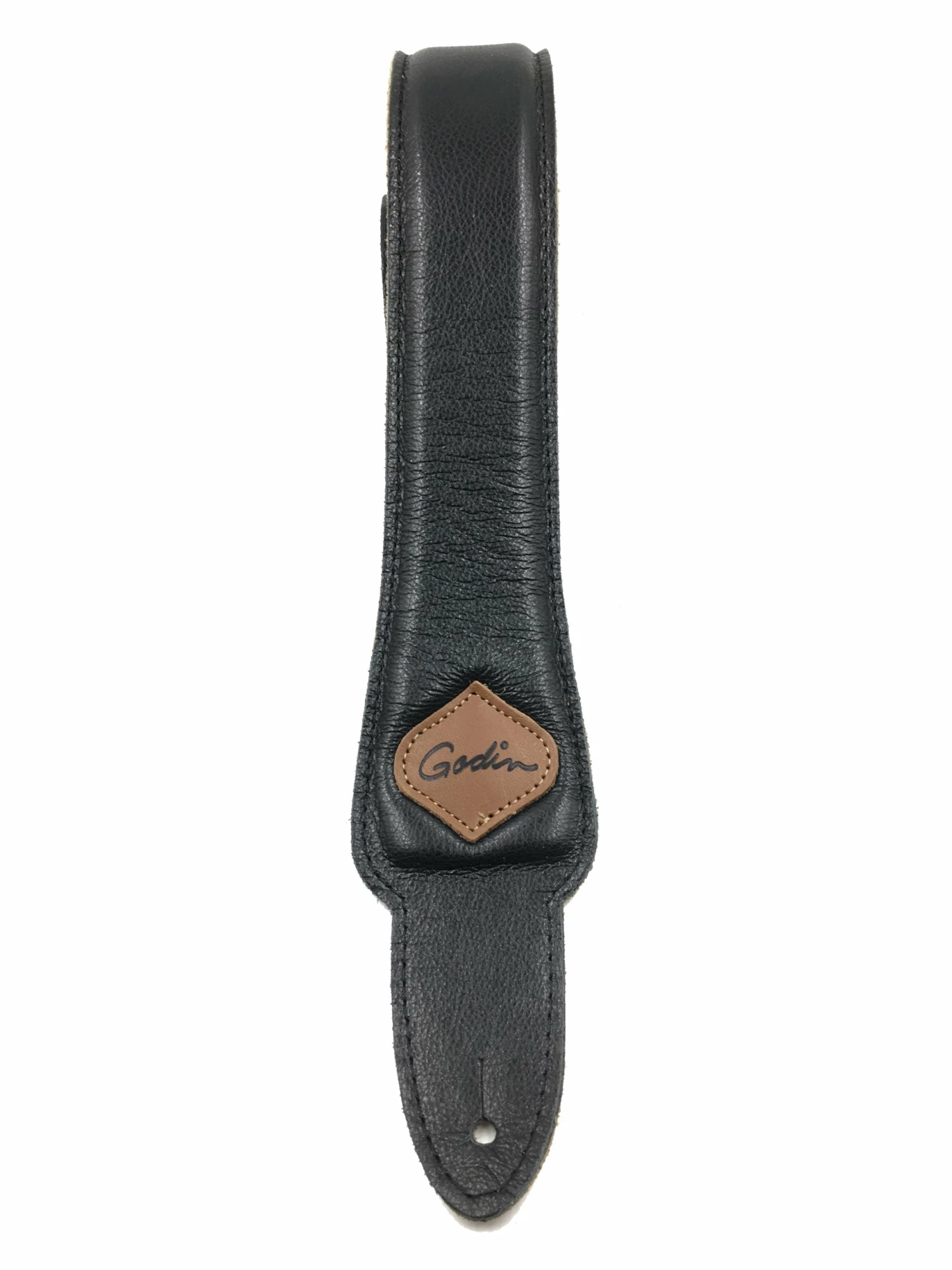 This Godin padded black leather guitar strap with patch Godin logo & a weathered, distressed look, features the comfort and quality of durable premium stitched leather.