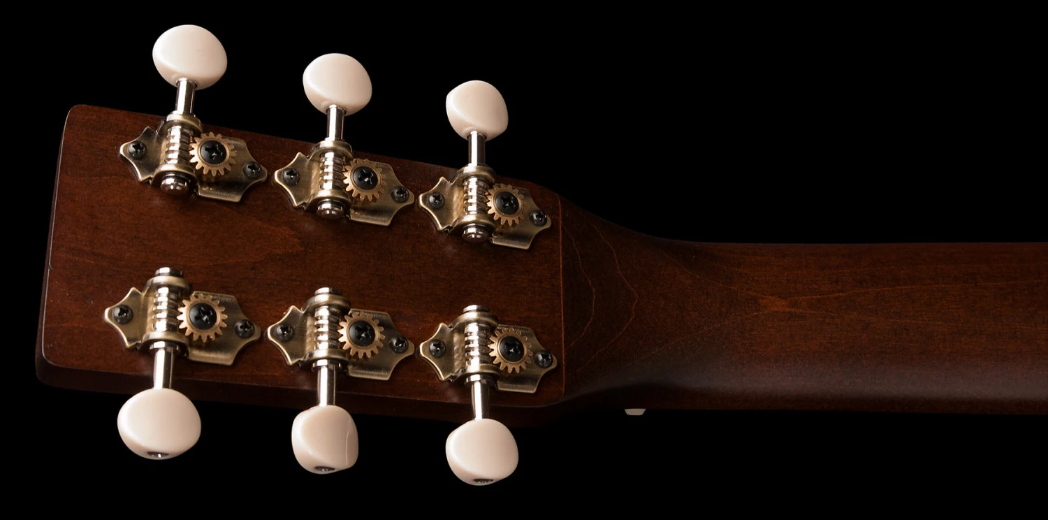 - Open-gear 16:1 antique brass tuning machines