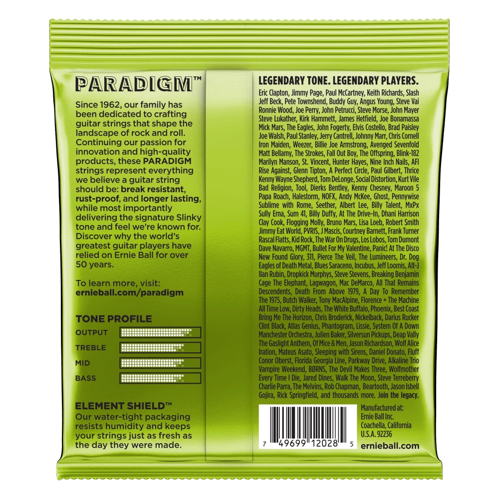 Ernie Ball Slinky Paradigm Electric guitar strings provide unprecedented strength and longer life while retaining 100% Slinky tone and feel. Ernie Ball’s industry leading ultra-high strength steel is included in both the wound and plain strings along with a patented reinforcement at the ball end twist of each plain string to provide superior tensile and fatigue strength for strings that lock into tune fast and hold up under the most stressful playing styles and conditions. The coupling of Ernie Ball’s Everlast nanotreatment with breakthrough plasma enhanced wrap wire provides added corrosion resistance and reduced accumulation of tone-robbing buildup and debris. Experience the first set of longer lasting strings that are worth playing with all benefits and no compromises. .010, .013, .017, .026, .036, .046, .056