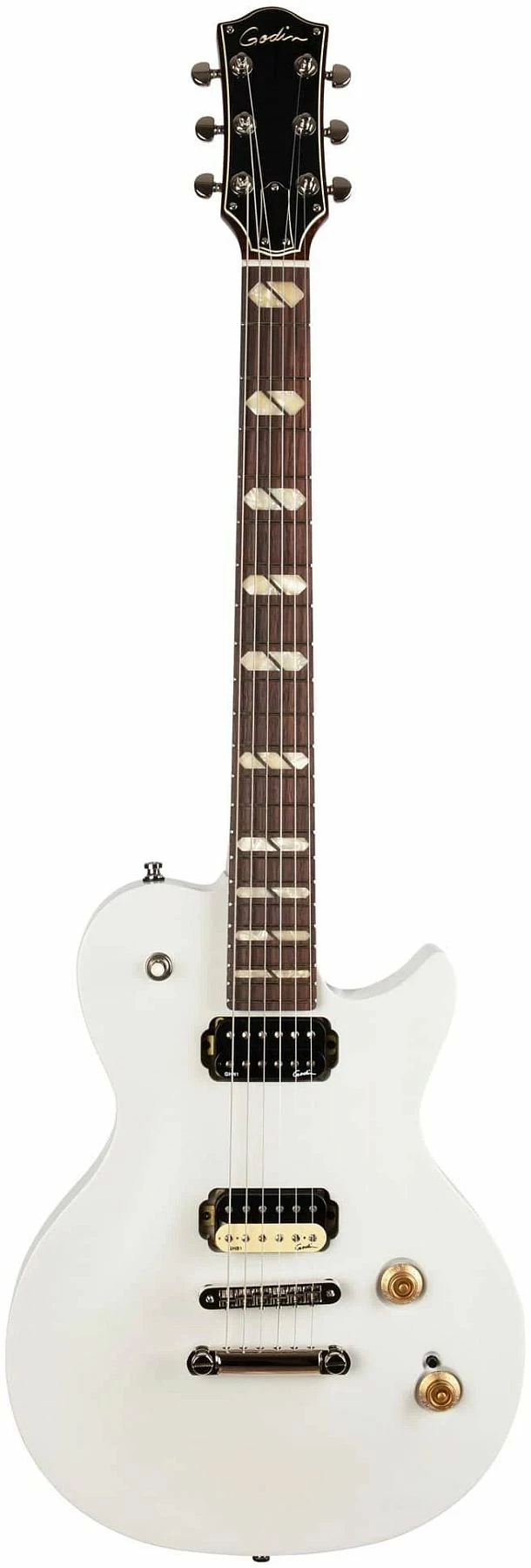 Get ready for some scorching tones with the direct-mounted Godin Custom Humbuckers and push the limits even further with the included Godin High Definition Revoicer system (H.D.R). Control your sound with ease via the precisely recessed volume and tone knobs and 3-way toggle switch. To top it all off, the guitar is presented in a pure Trans White semi-gloss finish.