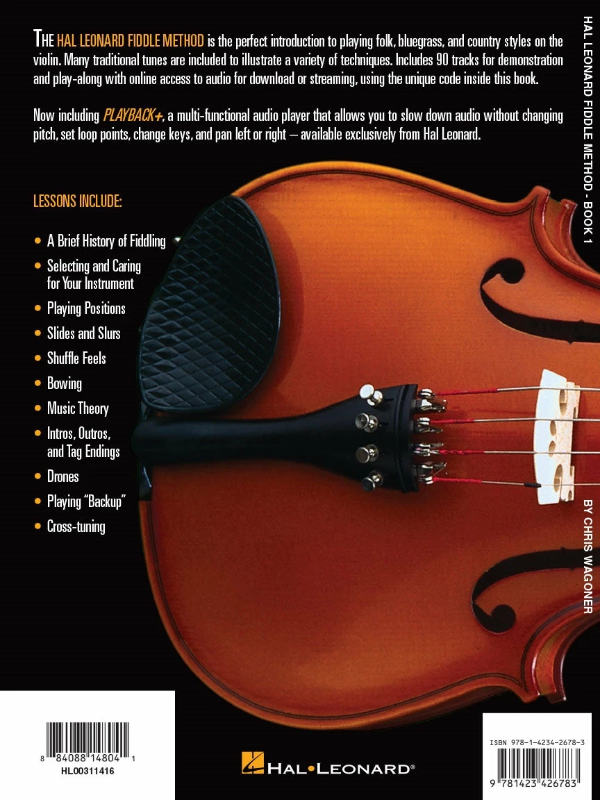 The Hal Leonard Fiddle Method is the perfect introduction to playing folk, bluegrass, and country styles on the violin. Many traditional tunes are included to illustrate a variety of techniques. The accompanying audio, available online for download or streaming, includes 90 tracks for demonstration and play-along. Lessons cover: instrument selection & care; playing positions; slides & slurs; bowing; music theory; drones; cross-tuning; and other essential topics.
