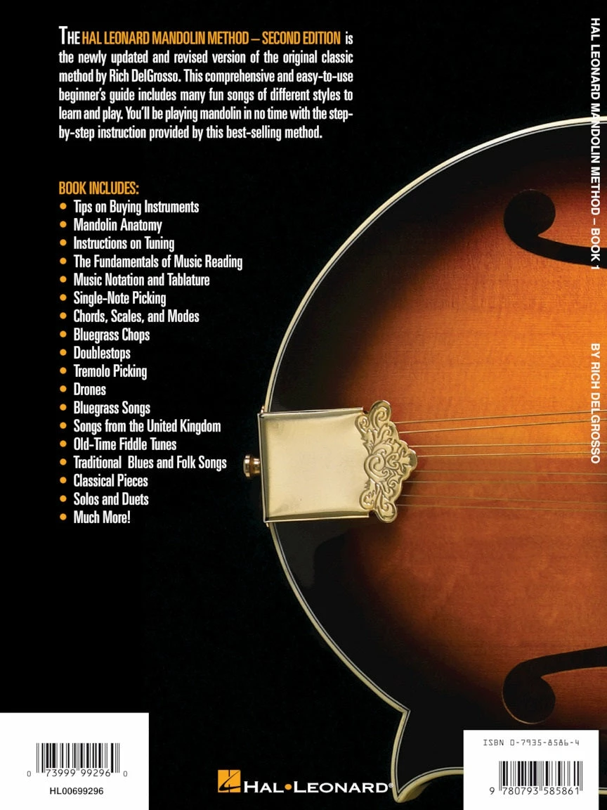 Theย Hal Leonard Mandolin Method โ Second Editionย is the newly updated and revised version of the original classic method by Rich Del Grosso. This comprehensive and easy-to-use beginner’s guide includes many fun songs of different styles to learn and play. You’ll be playing mandolin in no time with the step-by-step instruction provided by this best-selling method! The book includes: tips on buying instruments, mandolin anatomy, tuning instructions, fundamentals of music reading, single-note picking, bluegrass chops, doublestops, tremolo picking, drones, a variety of songs, and much, much more!