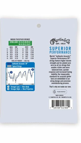 Martin® Authentic Acoustic® Superior Performance SP® strings feature higher tensile strength and tin-plated core wire on all six strings that enable a fuller and more balanced tone, quicker response and increased tuning stability. Our impeccable standards for acoustic guitar tone are embedded in our string design and precision manufacturing process. That’s why we make our own.