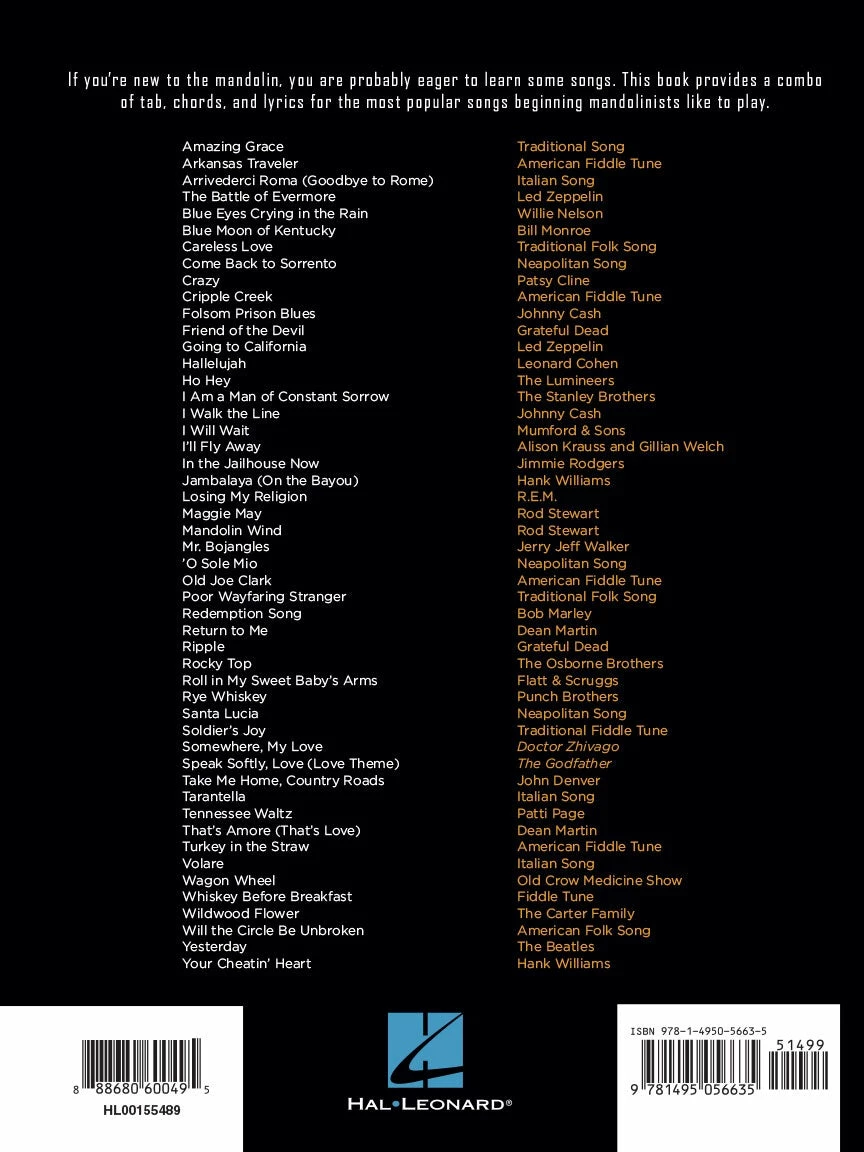 A fantastic collection of 50 accessible, must-know favorites for the beginner who’s learned enough to start playing popular songs! This book features a combo of tab, chords, and lyrics for: Amazing Grace โข Blue Eyes Crying in the Rain โข Crazy โข Cripple Creek โข Folsom Prison Blues โข Friend of the Devil โข Going to California โข Hallelujah โข Ho Hey โข I Am a Man of Constant Sorrow โข I Walk the Line โข I’ll Fly Away โข Losing My Religion โข Maggie May โข Mr. Bojangles โข Redemption Song โข Ripple โข Rocky Top โข Take Me Home, Country Roads โข Tennessee Waltz โข Wagon Wheel โข Wildwood Flower โข Yesterday โข Your Cheatin’ Heart โข and many more.