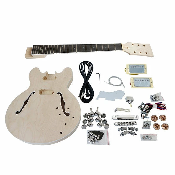 DIY 335ย Jazz electric guitar kit from JJ Music Sales.ย This high quality kit includes all parts to build a complete, playable guitar. Complete with strings andย cord.