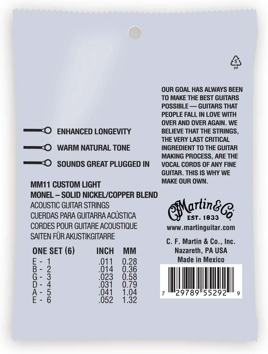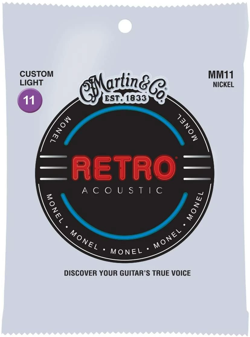 Martin Retro® strings are the real deal. Not an imitation. With Martin Retro® strings, you get one tough set that offers true, consistent tone and sounds like nothing else on the market. Martin’s solid nickel/copper alloy blend provides a reduced pick attack that allows the guitar’s tone woods to be heard, not overshadowed. Martin’s proprietary Monel wrap wire is naturally corrosion resistant, so you can play them for a long time with nothing to get in the way of your music. Discover your guitar’s true voice. Retro® strings offer enhanced longevity with warm natural tone, and they sound great plugged in.