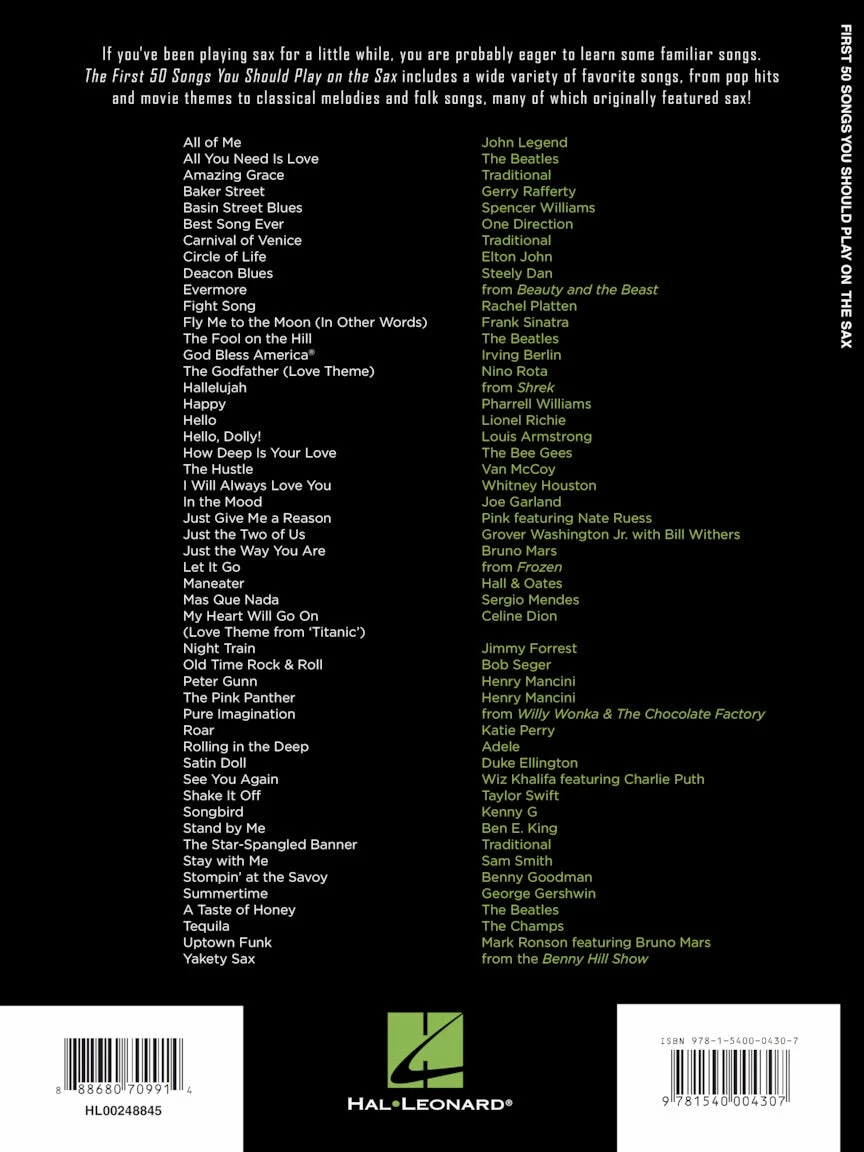 If you’ve been playing sax for a little while, you are probably eager to learn some familiar songs. This book includes a wide variety of favorite songs, from pop hits and movie themes to classical melodies and folk songs, many of which originally featured sax! Songs include: All of Me โข Baker Street โข Circle of Life โข Deacon Blues โข Fly Me to the Moon (In Other Words) โข The Godfather (Love Theme) โข Hallelujah โข In the Mood โข Just the Two of Us โข Maneater โข The Pink Panther โข Songbird โข Tequila โข Yakety Sax โข and more.