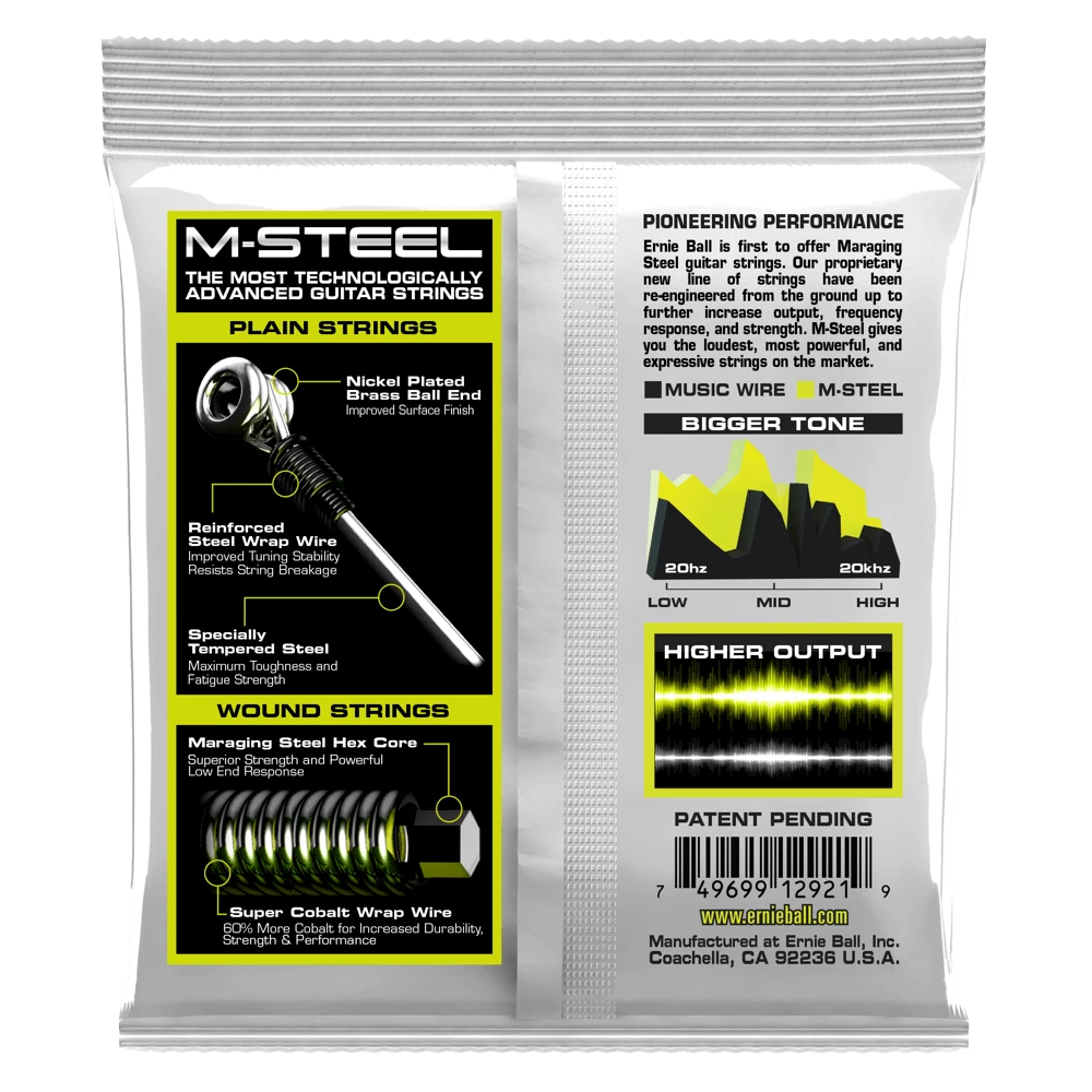 Ernie Ball M-Steel Electric Guitar Strings are made of a patented Super Cobalt alloy wrapped around a Maraging steel hex core wire, producing a richer and fuller tone with a powerful low-end response. M-Steel plain electric guitar strings are comprised of a specially tempered steel for maximum fatigue resistance. The electric plain strings also utilize a patented winding of steel around the ball end that reduces slippage, breakage and stays in tune better than conventional plain strings. Gauges .010, .013, .017, .026, .036, .046