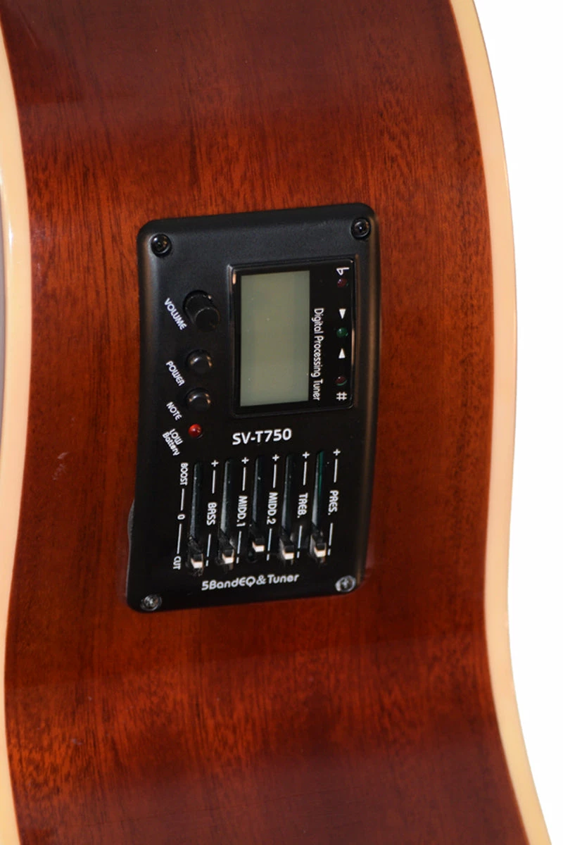 Big sound from a big jumbo body guitar. Five band EQ with built in tuner similar to those found on guitars costing much more. Venetian cutaway allows easy access to higher frets. Other professional type features such as dual ¼” and low Z XLR inputs round out the package.