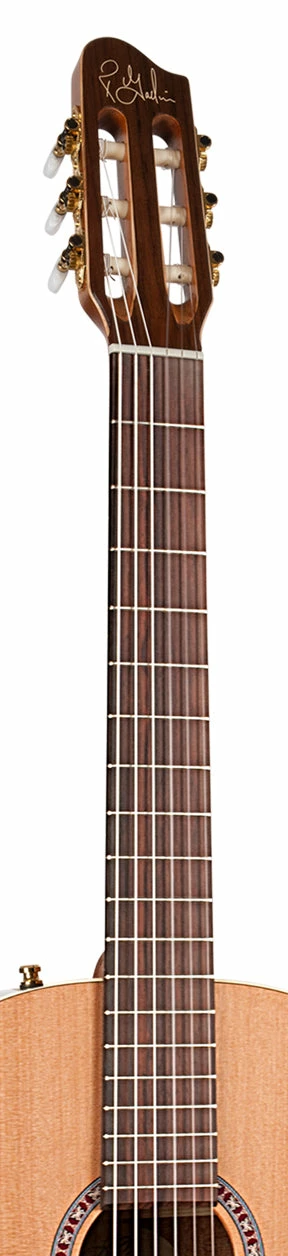 Classical guitars of the past have typically been made with thick neck dimensions, while this promoted a certain amount of neck stability, it often made certain playing aspects difficult to execute. It is for this reason that special attention was directed to the neck design of the these guitars. Neck width and string spacing conform to classical standards, but a new truss rod system allows the profile of the neck to be reduced producing a neck of extraordinary comfort, while increasing stability. The necks are carved from Honduras mahogany. All Concert models feature a rosewood fingerboard and bridge.