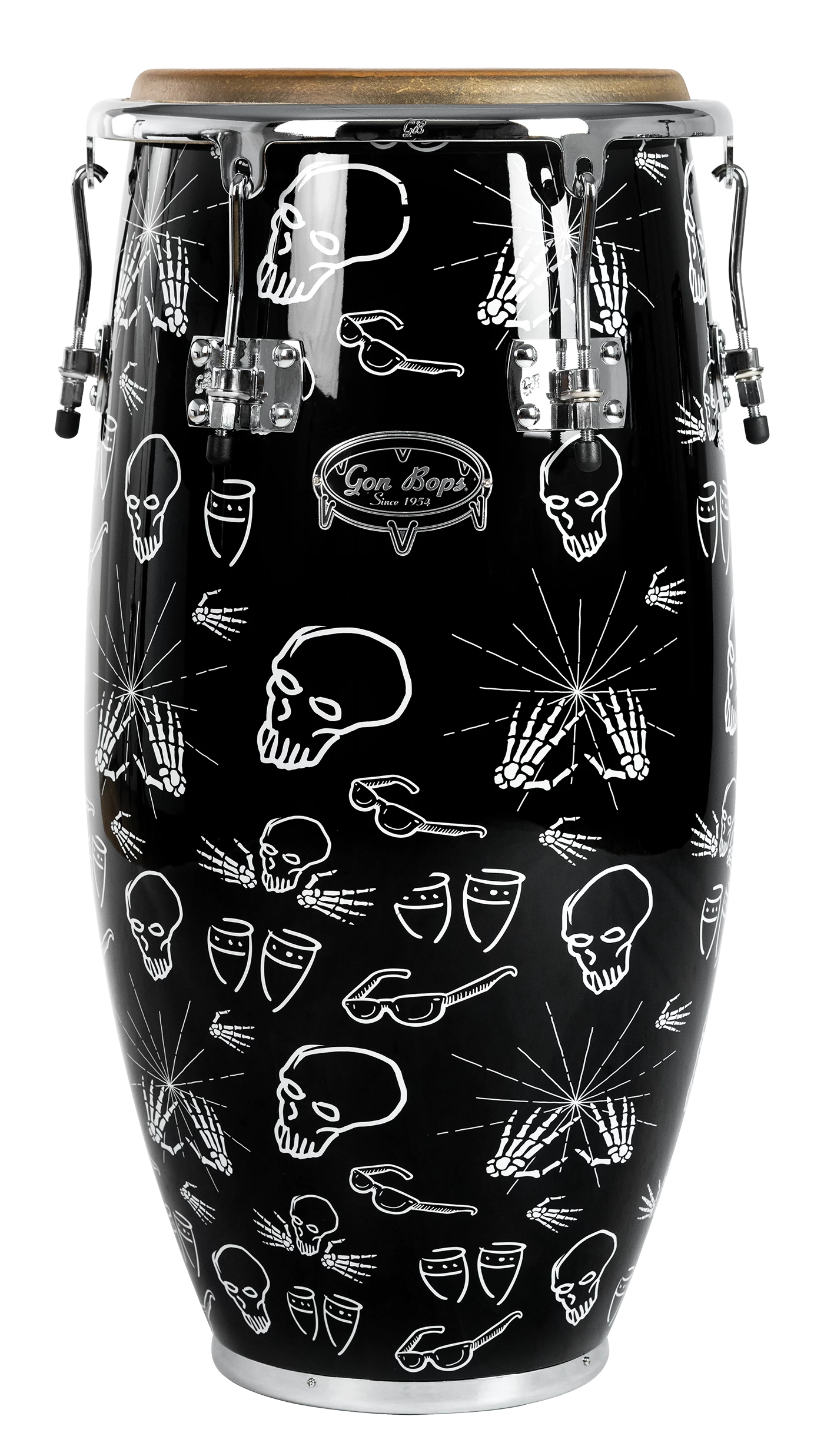 Our new Lenny Castro Signature Series Congas feature Asian Oak shells and come with teardrop top rings, for ease of extended playing time. Each head is hand-selected from natural rawhide, providing a warm, rich tone and features Lennyโs hand-drawn skull logo. Gon Bops Lenny Castro Series drums boast eye-popping, exciting original artwork, highlighting Lennyโs identifiable sunglasses, skull and conga sketches. A true reflection of this master percussionist, at an approachable price range.