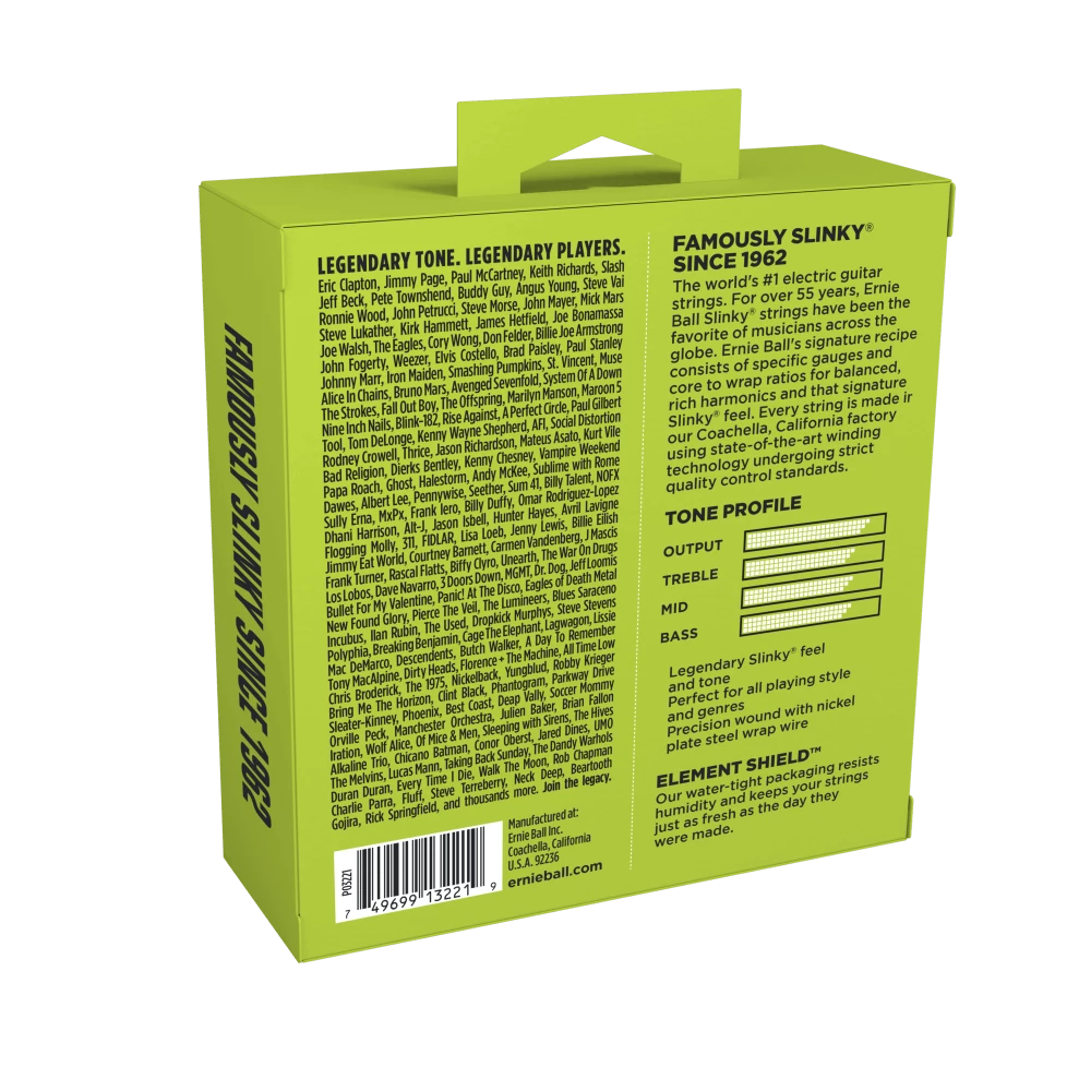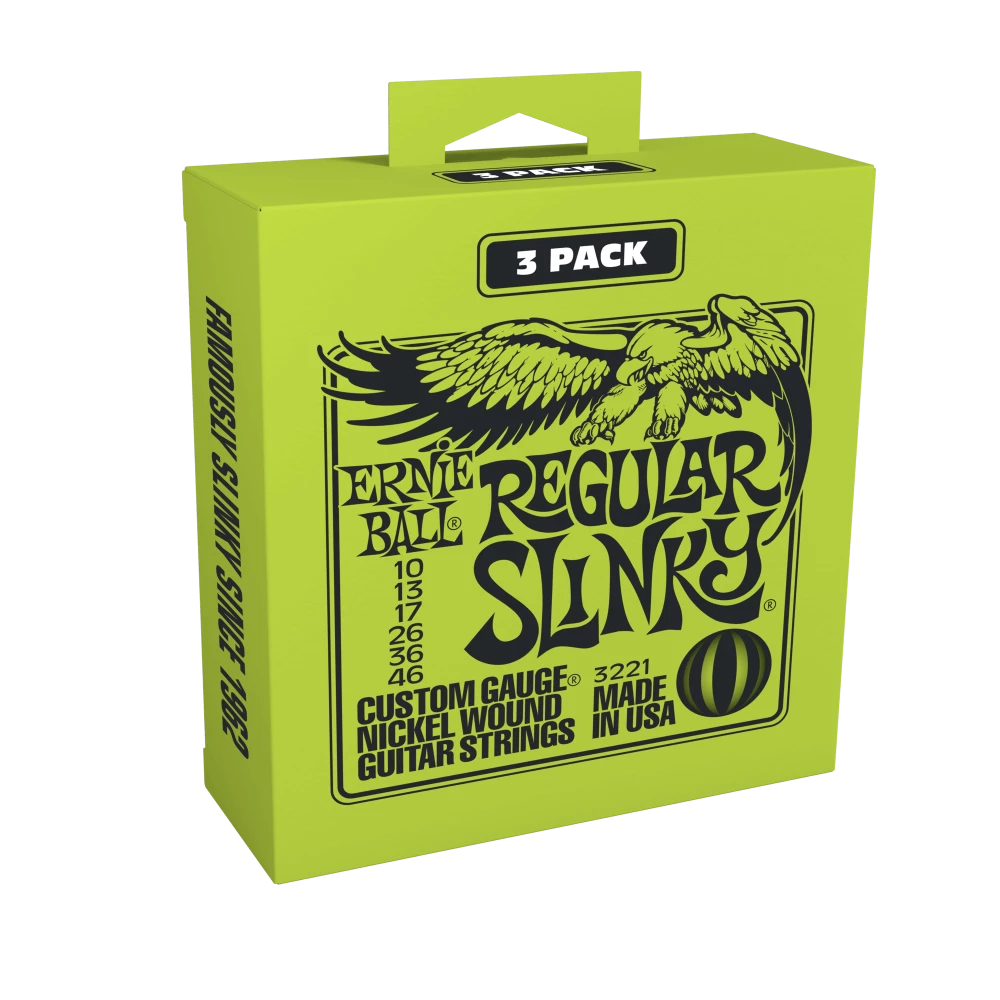 Now available in convenient three-set packs Ernie Ball Regular Slinky Electric Strings are our top selling set, and are favored by many musicians around the globe. Regular Slinky strings are played by Eric Clapton, John Mayer, Steve Vai and legions of guitar players worldwide These strings are precision manufactured to the highest standards and most exacting specifications to ensure consistency, optimum performance, and long life. Regular Slinky wound strings are made from nickel plated steel wire wrapped around a hex shaped steel core wire. The plain strings are made of specially tempered tin plated high carbon steel producing a well balanced tone for your guitar. Gauges .010, .013, .017, .026, .036, .046