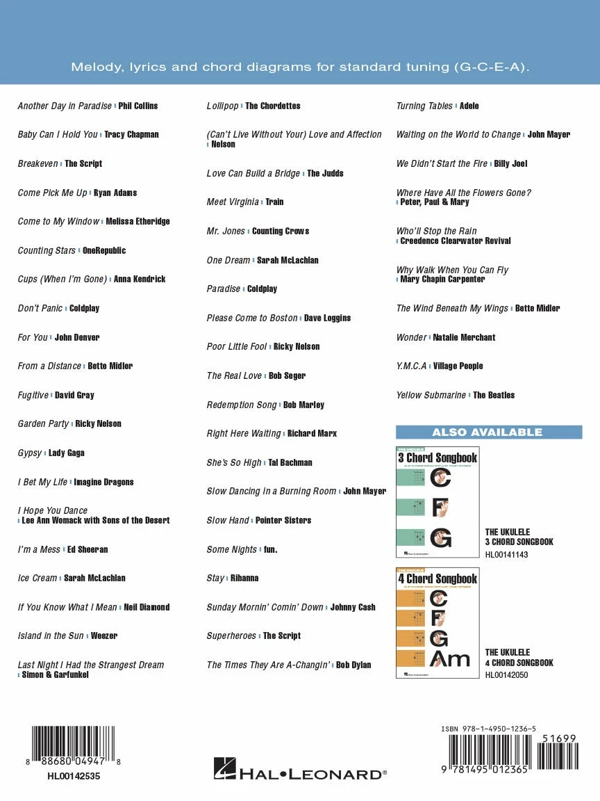 All it takes is a ukulele and 5 chords to play these 50 great tunes: Come to My Window โข Cups (When I’m Gone) โข Garden Party โข I Bet My Life โข Island in the Sun โข Meet Virginia โข Mr. Jones โข Please Come to Boston โข Redemption Song โข Some Nights โข Stay โข The Times They Are A-Changin’ โข We Didn’t Start the Fire โข Who’ll Stop the Rain โข Yellow Submarine โข and many more. Includes melody line, chord diagrams and lyrics.