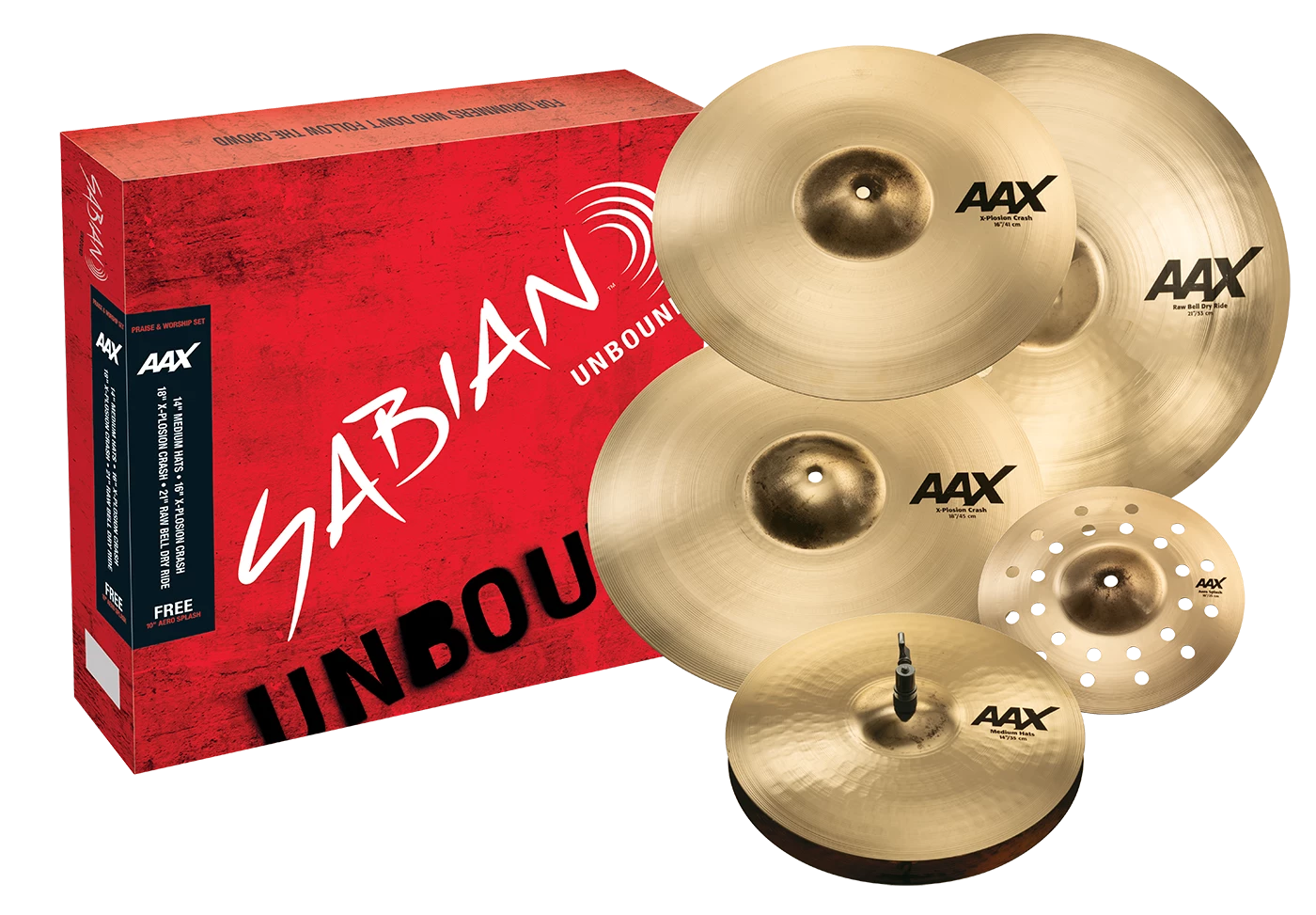 Sonically matched in the SABIAN Vault for church, gospel and R&B players, the SABIAN AAX Praise & Worship Set includes AAX 14โณ Medium Hats, 16โณ and 18โณ AAX X-Plosion Crashes, a 21โณ AAX Raw Bell Dry Ride and a FREE 10โณ AAX Aero Splash.