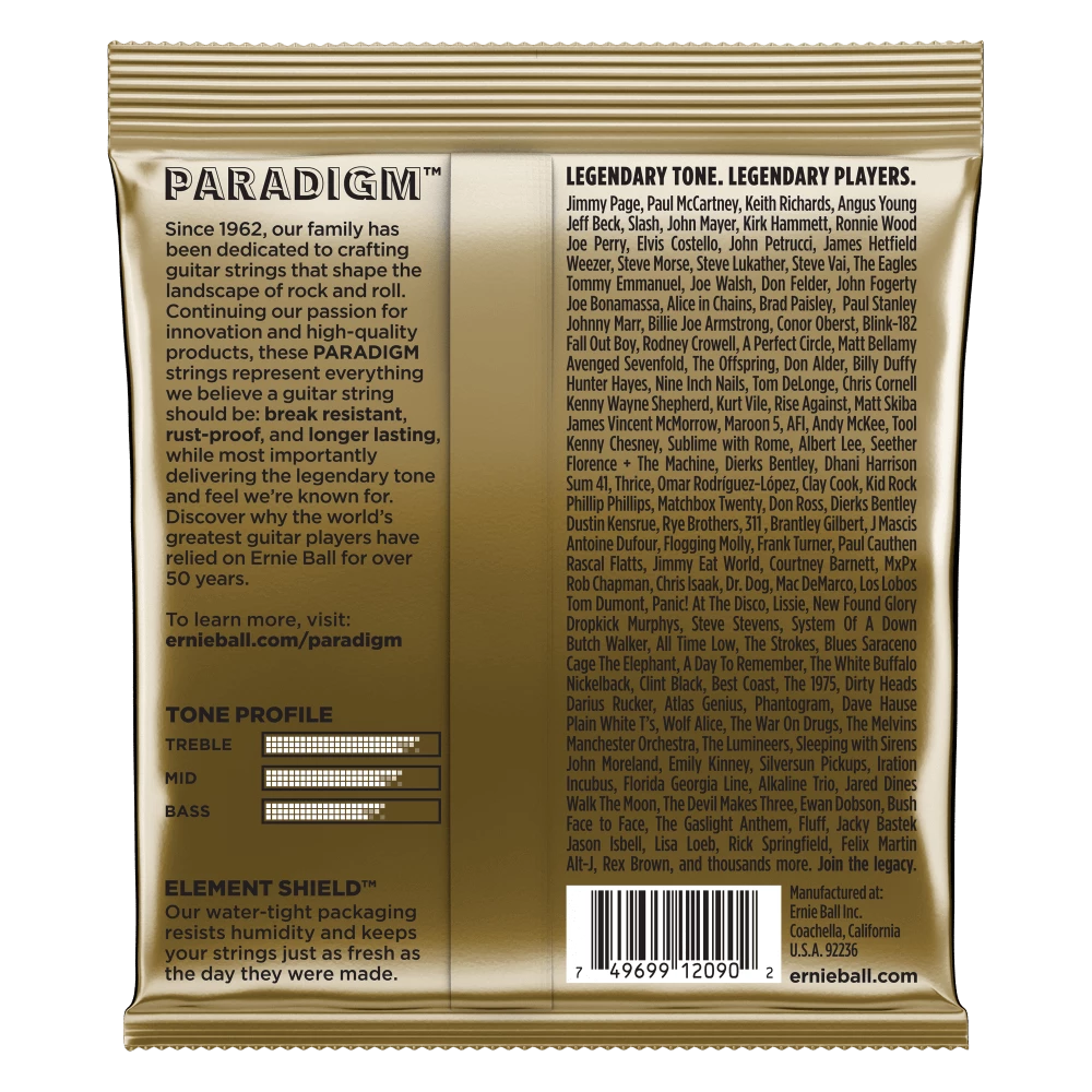 Ernie Ball Slinky Paradigm Acoustic guitar strings provide unprecedented strength and longer string life while retaining 100% Earthwood tone and feel. Ernie Ball’s industry leading ultra-high strength steel is included in both the wound and plain strings to provide superior tensile and fatigue strength for strings that lock into tune fast and hold up under the most stressful playing styles and conditions. The coupling of Ernie Ball’s Everlast nanotreatment with breakthrough plasma enhanced wrap wire provides added corrosion resistance and reduced accumulation of tone-robbing buildup and debris. Experience the first set of longer lasting strings that are worth playing with all benefits and no compromises. Gauges .010, .014 .020, .028, .040, .050