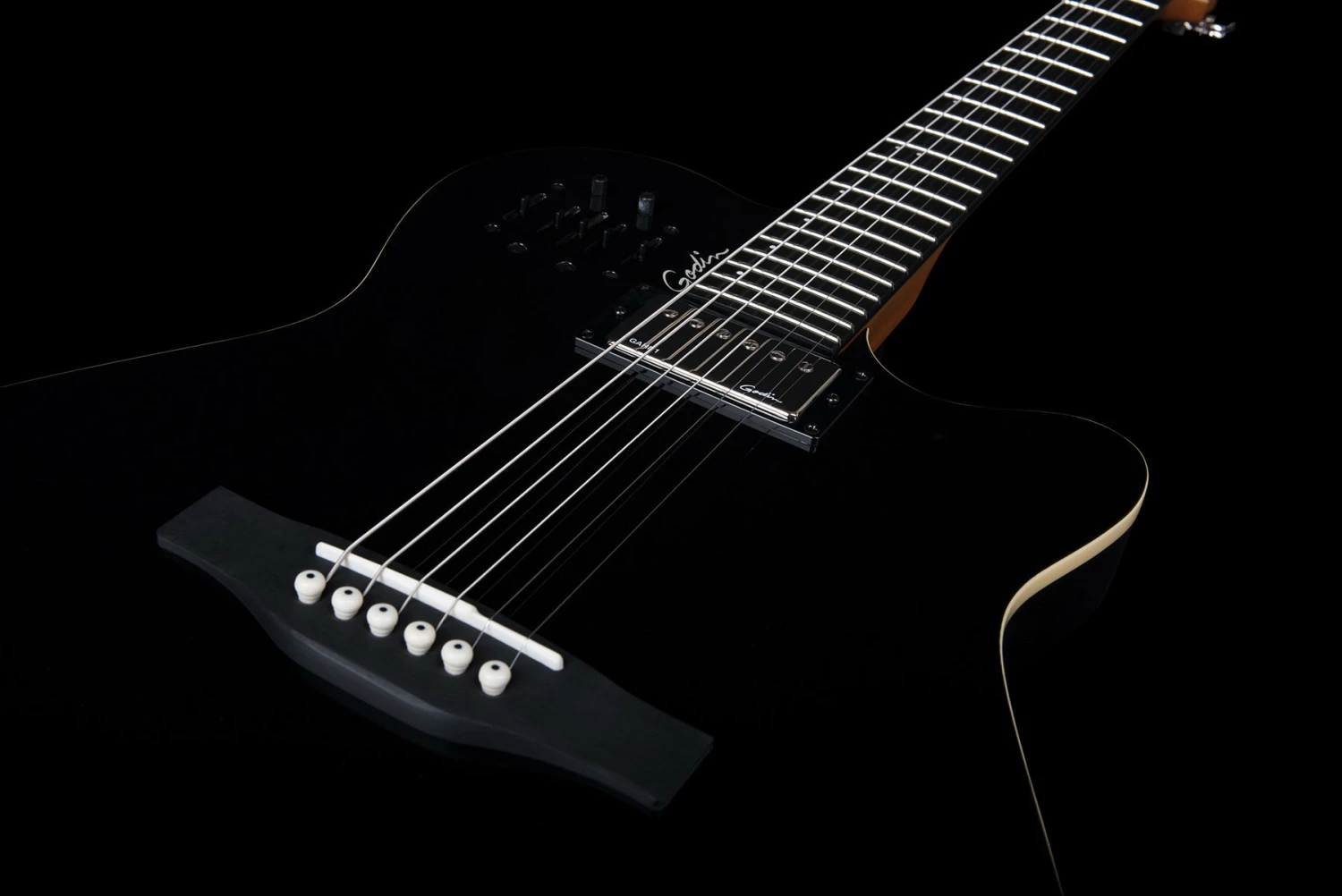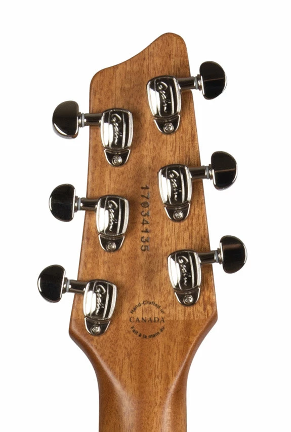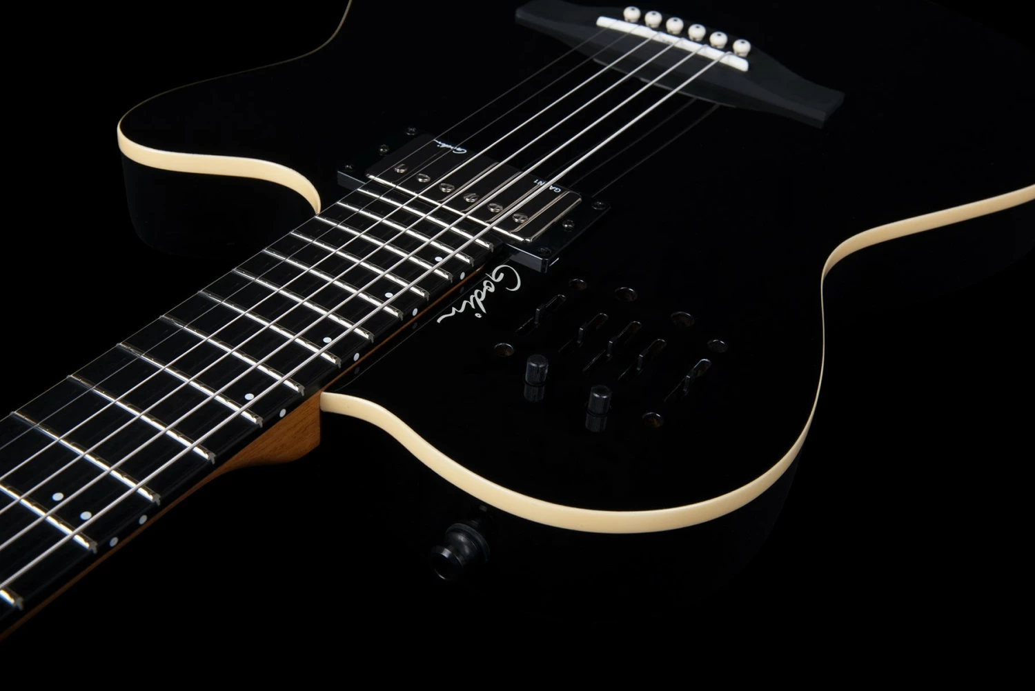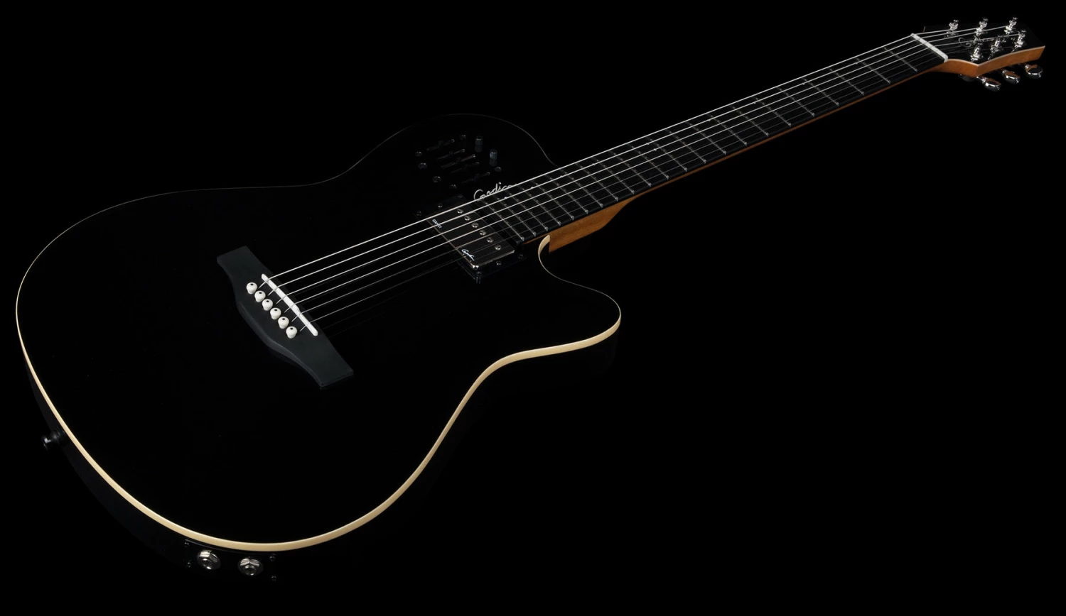These features stand true and better than ever in the A6 Ultra with the added “Oomph!” and full tone of a Godin humbucker in the neck position, along with an under-saddle transducer, dual outputs (acoustic and electric) that combine for a huge sound and a Custom Godin preamp section voiced specifically for the A6 Ultra. This preamp section gives a player the chance to control their tone via sliders for acoustic volume, treble, mid, bass and independent controls for the electric humbucker volume, treble and bass.