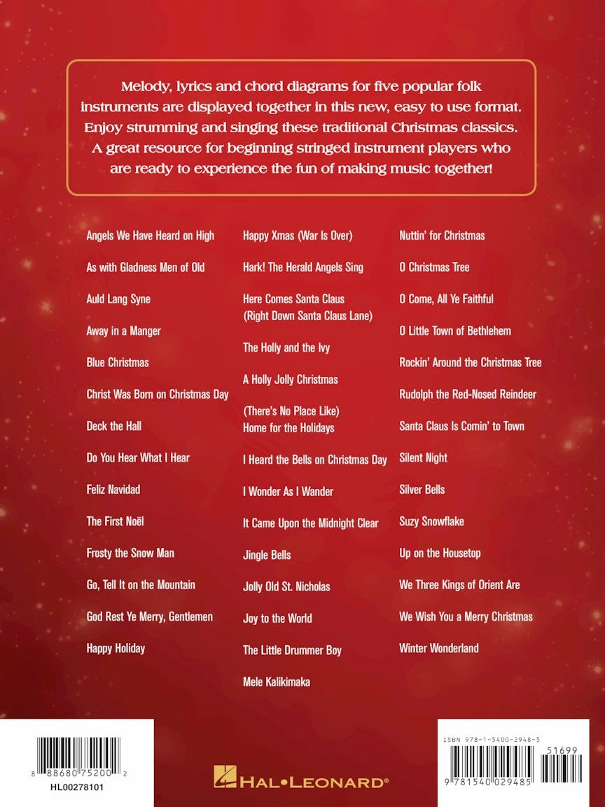 The Strum Together series enables players of five different instruments โ or any combination of them โ to โstrum togetherโ on over 40 great songs. This easy-to-use format features melody, lyrics, and chord diagrams for standard ukulele, baritone ukulele, guitar, mandolin, and banjo. Songs include: Angels We Have Heard on High โข Away in a Manger โข Blue Christmas โข Deck the Hall โข The First Noel โข Go, Tell It on the Mountain โข A Holly Jolly Christmas โข It Came upon the Midnight Clear โข Jingle Bells โข Mele Kalikimaka โข O Come, All Ye Faithful โข Rudolph the Red-Nosed Reindeer โข Silent Night โข Up on the Housetop โข We Wish You a Merry Christmas โข and more.