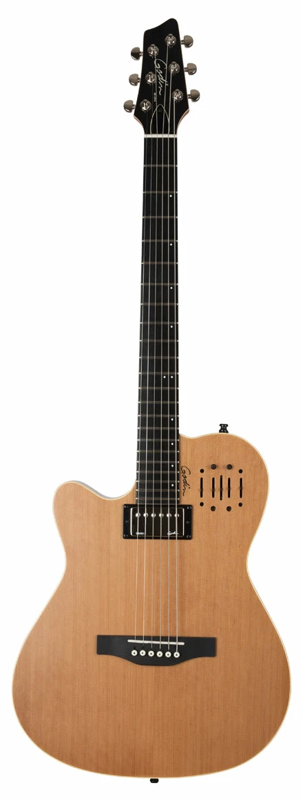 The A6 Ultra continues with the innovative concepts found in all Godin A-series guitars, such as combining an amazing plugged-in acoustic sound with the feel of an electric neck, along with a chambered body design that virtually eliminates feedback in live & loud settings. These features stand true and better than ever in the A6 Ultra with the added โOomph!โ and full tone of a Godin humbucker in the neck position. In addition, the under-saddle transducer and dual outputs (acoustic and electric) combine for a huge sound with the help of a Custom Godin preamp, which is voiced specifically for the A6 Ultra. This preamp section enables the player to control their tone via sliders for acoustic volume, treble, mid, bass EQ, and independent controls for the electric humbucker volume, treble, and bass. Whether plugging into the single acoustic mix or via both outputs, controlling your tone is at your fingertips. And, the A6 Ultra delivers in all styles of music: from jazz to rock to country, not to mention that it is also a great slide guitar for blues.