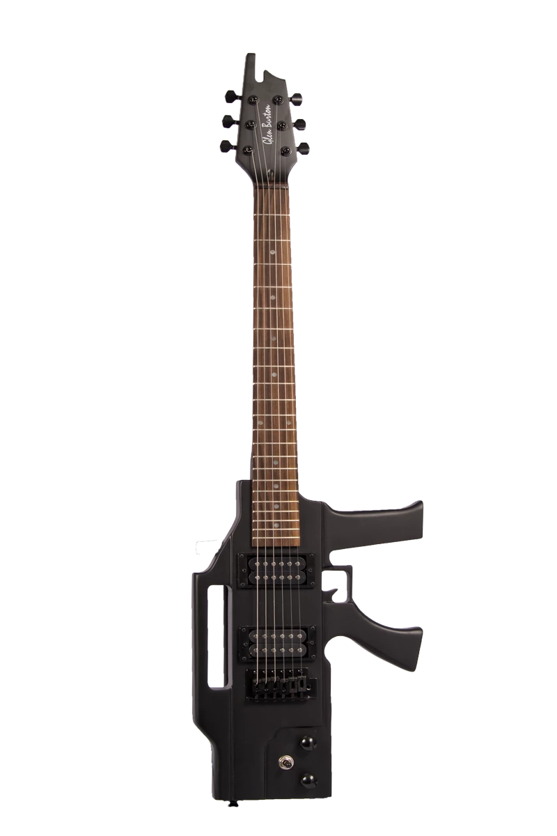 The Glen Burton AK47 sharp guitar is an actual, playable electric guitar that looks like a machine gun. This cool guitar features dual humbucker pickups and a whammy bar for all out rock and roll raging! Black anodized hardware rounds out this guitarโs mean looks.