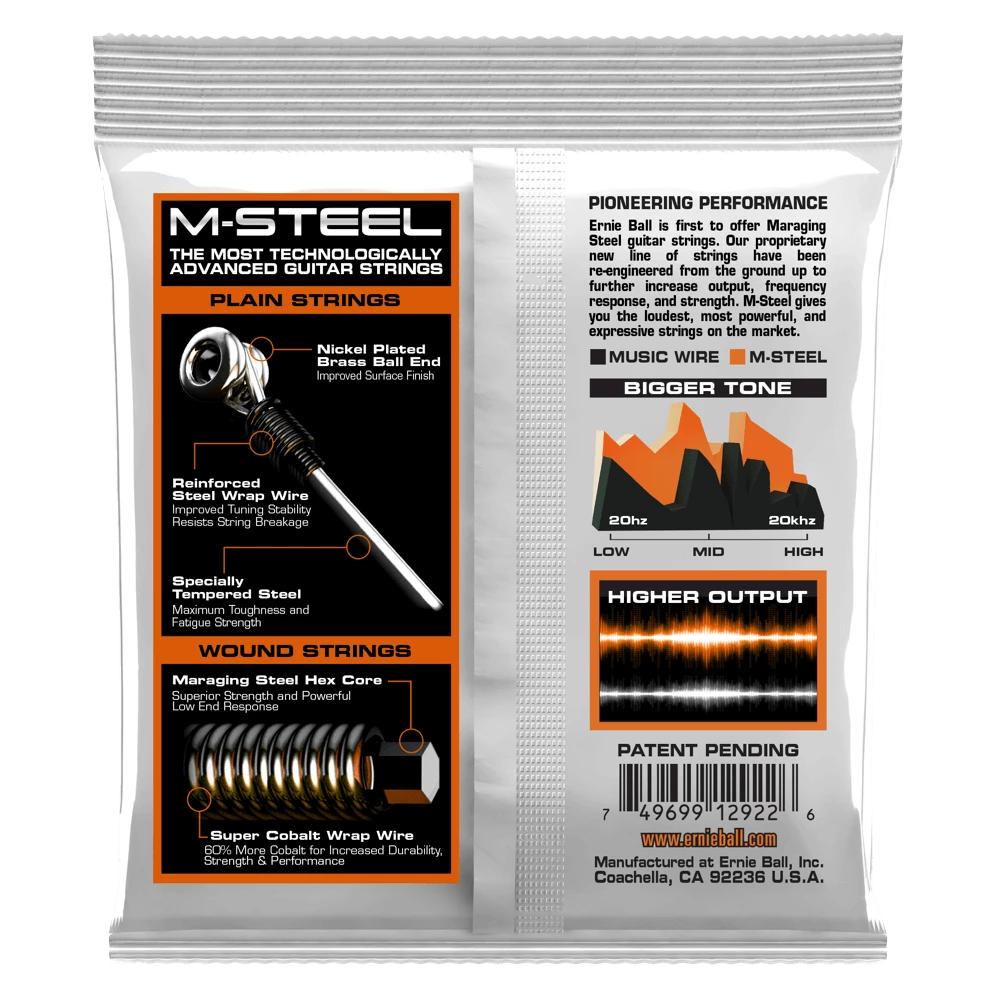 Ernie Ball M-Steel Electric Guitar Strings are made of a patented Super Cobalt alloy wrapped around a Maraging steel hex core wire, producing a richer and fuller tone with a powerful low-end response. M-Steel plain electric guitar strings are comprised of a specially tempered steel for maximum fatigue resistance. The electric plain strings also utilize a patented winding of steel around the ball end that reduces slippage, breakage and stays in tune better than conventional plain strings. Gauges .09, .011,.016, .026, .036, .046