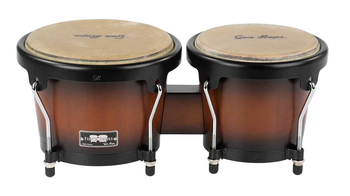 Gon Bops announces an expanded line of Fiesta drums! Now including a professional-size 7โ/8.5โ bongo in a beautiful sunburst finish, they deliver legendary Gon Bops quality and tone at a price designed with the average percussionistโs budget in mind. Black powder-coated teardrop style top ring provides long-playing comfort, while the combination of Siam Oak shells and pre-fitted rawhide heads produces warm lows and cutting high tones. Gon Bops Fiesta Bongos are a serious set of drums you can play confidently on-stage โ not only do they sound great, they look great too!