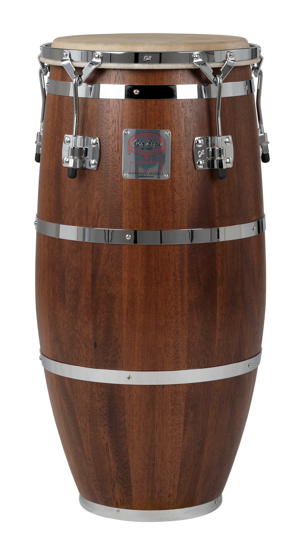 Since 1954, Gon Bops has been crafting the finest Latin instruments in the world. Named after founder Mariano Bobadilla, Gon Bops Mariano Congas continue that tradition of authentic Cuban look and sound. Designed with genuine calfskin heads, select lightweight Durian wood and traditional hardware, these wonderful drums offer full-bodied authentic sound โ from big, resonant open tone to crisp slaps and solid bass strokes. Now available with a chrome hardware upgrade, Mariano congas are available now in 4 sizes from Quinto to Super Tumba, and bongos are a 7โ/8.5โ pairing. Gon Bops Mariano drums are the sound of Cuba!
