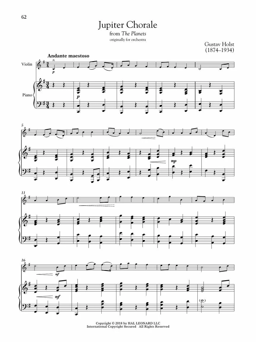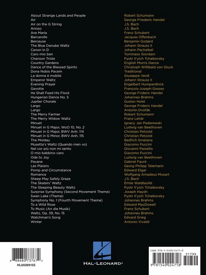 50 simply arranged, must-know works by Bach, Brahms, Handel, Tchaikovsky and more for violin! The book includes piano accompaniment and a separate pull-out part for violin. Selections include: The Blue Danube Waltz (Johann Strauss II) • Canon in D (Johann Pachelbel) • Dona Nobis Pacem (traditional) • Evening Prayer (Engelbert Humperdinck) • He Shall Feed His Flock (George Frideric Handel) • Jupiter Chorale (Gustav Holsts) • Ode to Joy (Ludwig van Beethoven) • Pomp and Circumstance (Edward Elgar) • Sheep May Safely Graze (J.S. Bach) • Swan Lake (Theme) (Pyotr Il’yich Tchaikovsky) • To a Wild Rose (Edward MacDowell) • and many more.