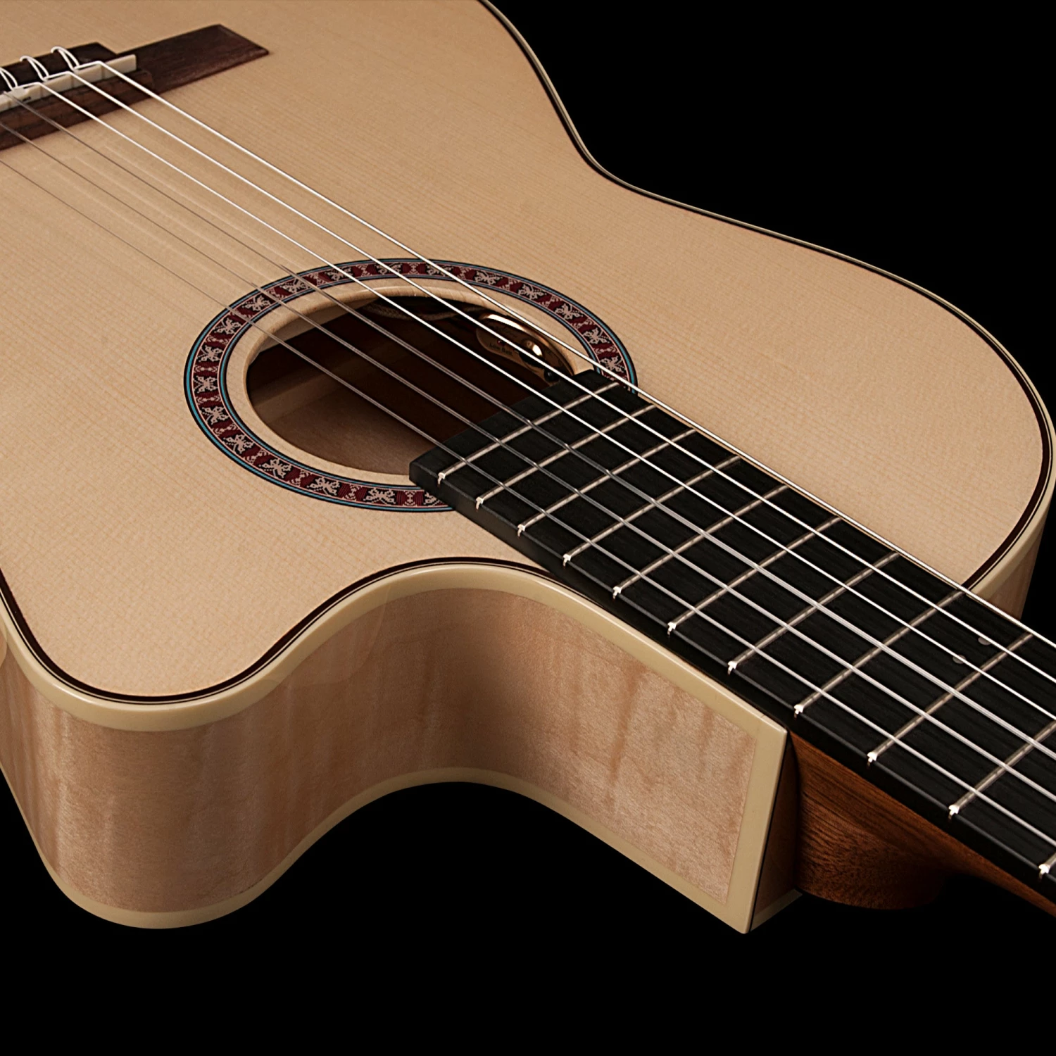 The Godin Arena Flame Maple CW is a spellbinding thinline nylon-string guitar focused on high prestige and performance to take your playing and creativity to new heights. The Arena Flame Maple CW is an extremely comfortable guitar with features and playability that will immediately inspire any player. Such features include a slight fretboard radius for ultimate comfort in your left hand, a finely detailed rosette, a Flame Maple body complemented by a select pressure tested solid Spruce top, a custom polished high-gloss finish, a generous cutaway and non-restrictive heel for ultimate upper fret access, a sleek and smooth playing Richlite fretboard, and an innovative double-action truss rod system to break away from the norm and set new grounds for the modern player.