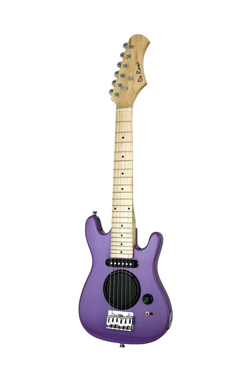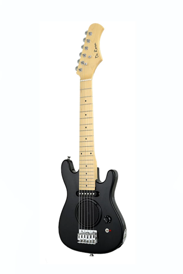 The De Rosa is a great little starter guitar for children 3 and up. Featuring a battery powered built-in speaker amplifier that cranks out a nice edgy tone for your kid to rock out! If the speakers aren’t loud enough, this guitar also has an amp input available to plug into any standard guitar amp. This guitar also offers an attractive gloss finish and light weight body that is about 30 inches in length, perfect size for a child. Included with this guitar is a starter pack with everything needed to rock! ย ย