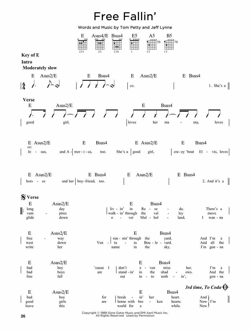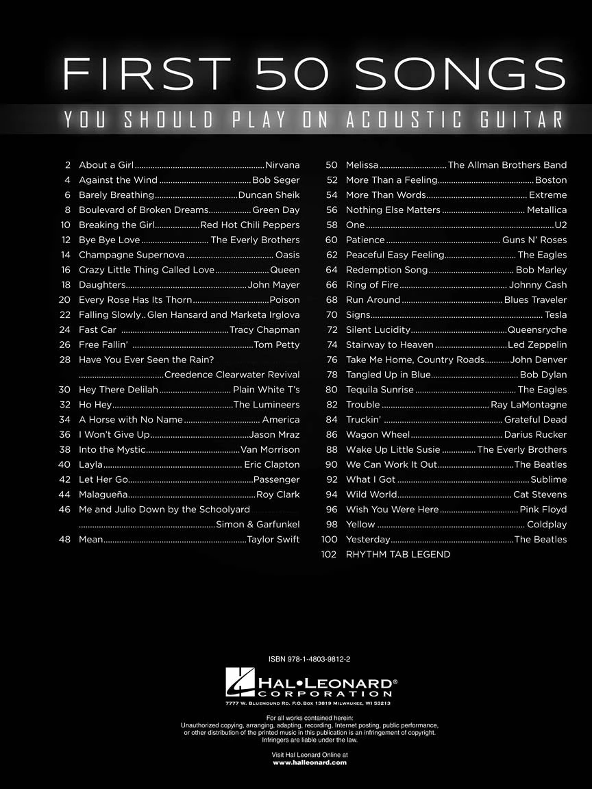 If you’re new to the guitar, you are probably eager to learn some songs. This book provides a combo of tab, chords, and lyrics for the most popular songs beginning guitarists want to play on the acoustic guitar. Includes: Against the Wind โข Barely Breathing โข Boulevard of Broken Dreams โข Champagne Supernova โข Crazy Little Thing Called Love โข Every Rose Has Its Thorn โข Fast Car โข Free Fallin’ โข Hey There Delilah โข Ho Hey โข I Won’t Give Up โข Layla โข Let Her Go โข Mean โข One โข Ring of Fire โข Signs โข Stairway to Heaven โข Trouble โข Wagon Wheel โข Wish You Were Here โข Yellow โข Yesterday โข and more.