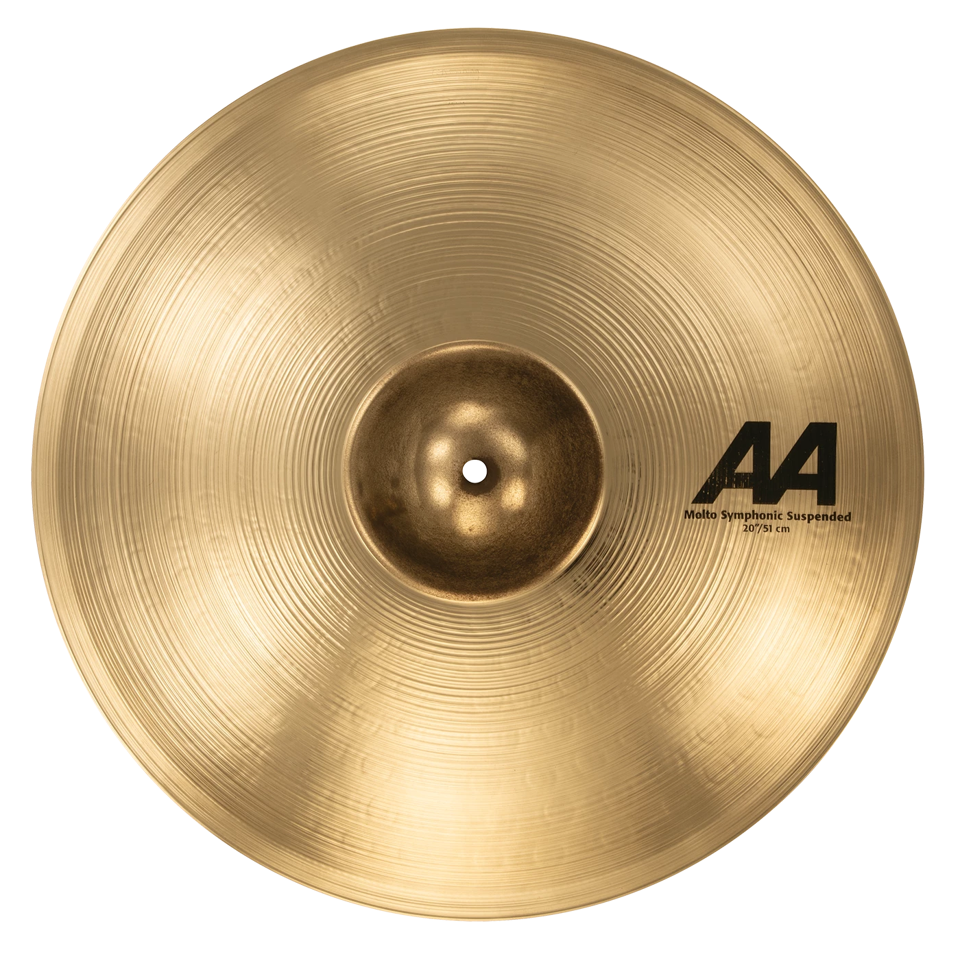 SABIAN 20โ AA Molto Suspended Cymbals are crafted from SABIAN B20 bronze and are a popular choice with band and orchestral programs. They are typically darker than AA Suspended Cymbals. They also have a flanged edge that aids in controlling sustain. The 20″ AA Molto Suspended Cymbal is a great choice for bands and orchestras when a general suspended cymbal that can produce a moderately bright sound at loud volume is required. Because its a 20″ cymbal, it wont be as sensitive as smaller cymbals when played at softer dynamics. As a series, AA Molto suspended cymbals have a moderate response time and take slightly longer for the sound to blossom than AAX, HH, HHX and Artisan cymbals.