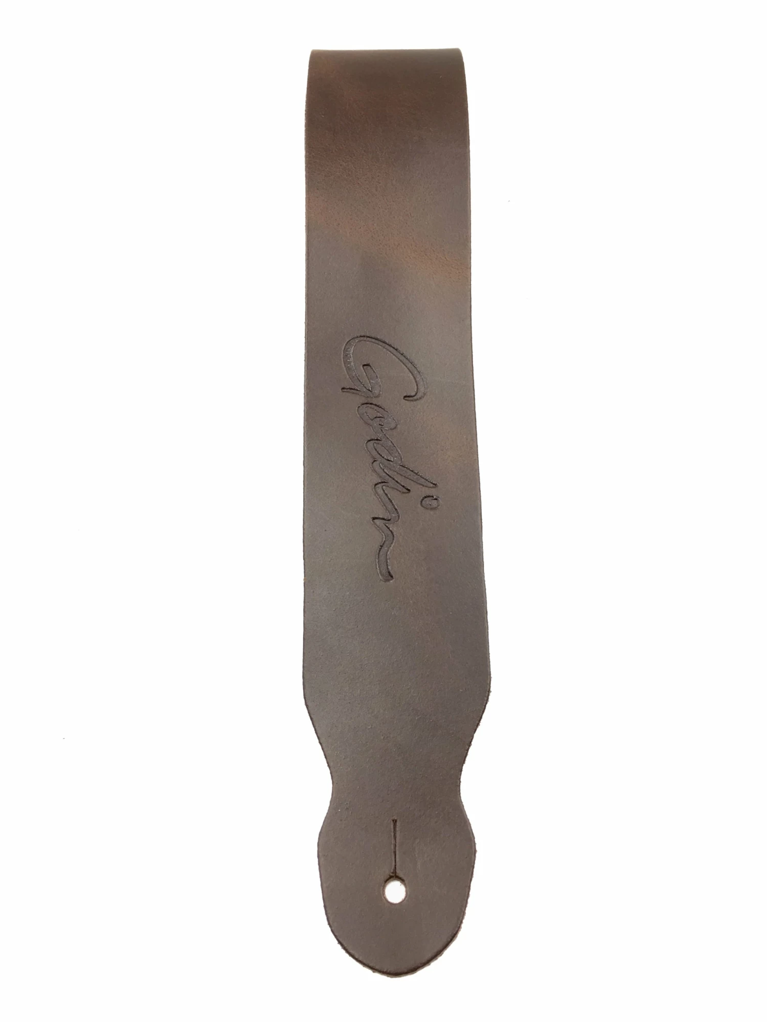 This Godin guitar strap with embossed Godin logo features the comfort and quality of durable premium stitched brown leather.