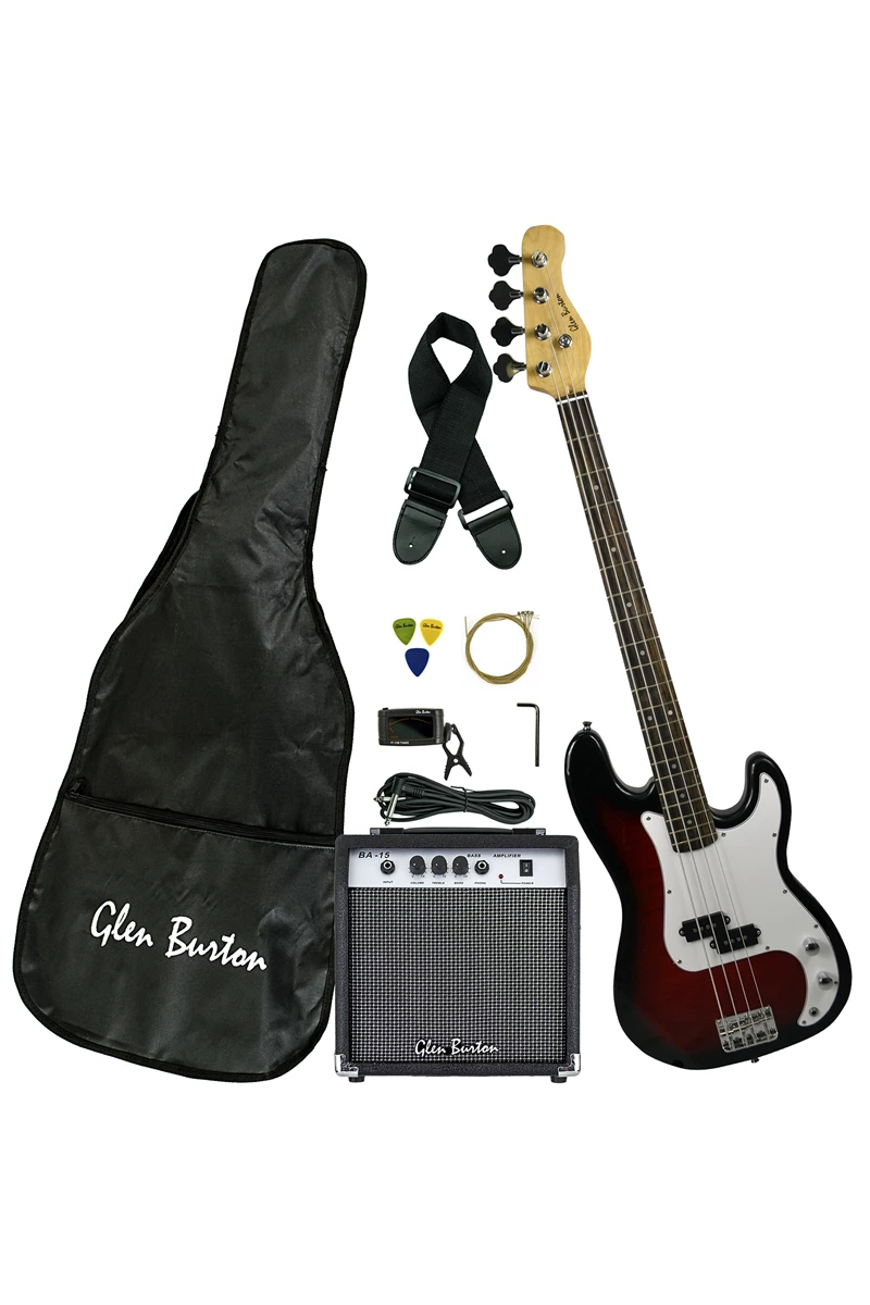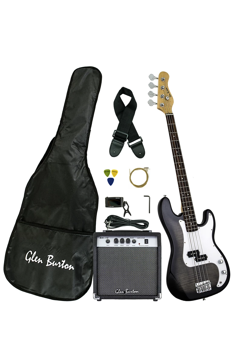 The Glen Burton P Style bass combo is the ultimate bass guitar for those looking for comfort, good sound, and classic look all for an affordable price. Comprised of a solid basswood body and beautiful flamed top, comfortable maple neck, and a rosewood fingerboard, the GB150 bass provides the right sound for any musical genre. The included fifteen watt bass amplifier is perfect for practice and low volume jams. Whether you are just starting out, need a bass for occasional use or just want a solid working bass that’s easy to own as it is to play, the Glen Burton GB150BCO is a natural choice