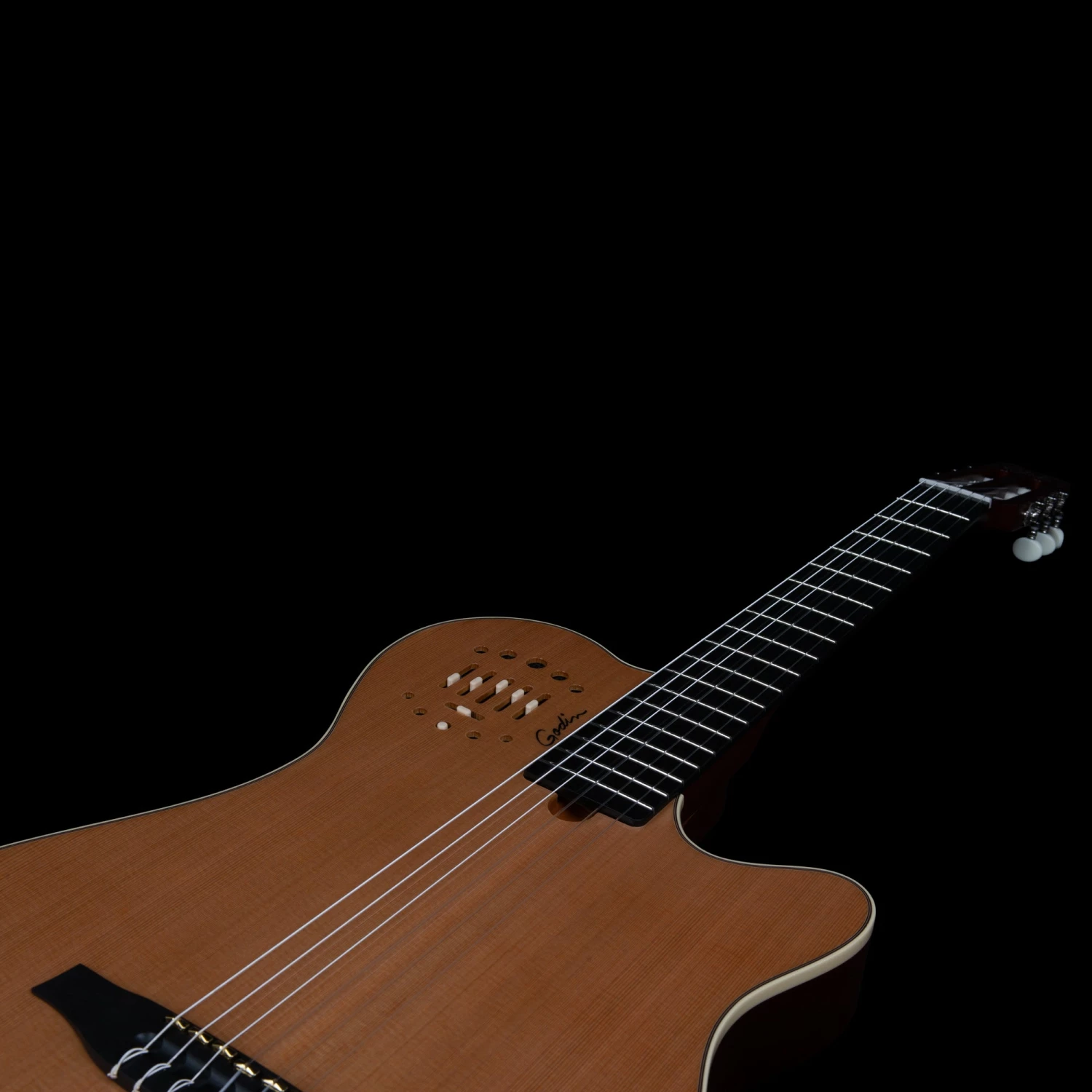 The Multiac Grand Concert Deluxe offers a degree of sophistication and performance like no other in the realm of modern nylon guitars. This guitar represents a truly visionary Godin design, along with the culmination of a close collaboration with LR Baggs to develop a truly cutting-edge Custom Voiced preamp system. The Grand Concert Deluxe offers an acoustic sound from the bridge saddles that is crisp and clear, and the possibility to blend the Lyric mic for a tone that is pristine and able to capture the most musical and airy subtleties within the notes. Not to mention, the Lyric Mic allows the guitarโs top to come to life for highly touch-sensitive percussive tapping and rhythms; perfect for Flamenco and all other flamboyant nylon-playing styles. Much like other Multiac models, the Deluxe provides a uniquely chambered design that is free of feedback, which enables the player to play freely and in controlโeven in the noisiest live environments. Other notable key features include a Two-Chambered Solid Mahogany Body, Solid Cedar Top, Richlite Bridge and Fretboard, a 2-inch Graphtechโข Nut, and a shimmering High-Gloss Natural Finish. The Grand Concert Deluxe; for music that is above and beyond the ordinary.