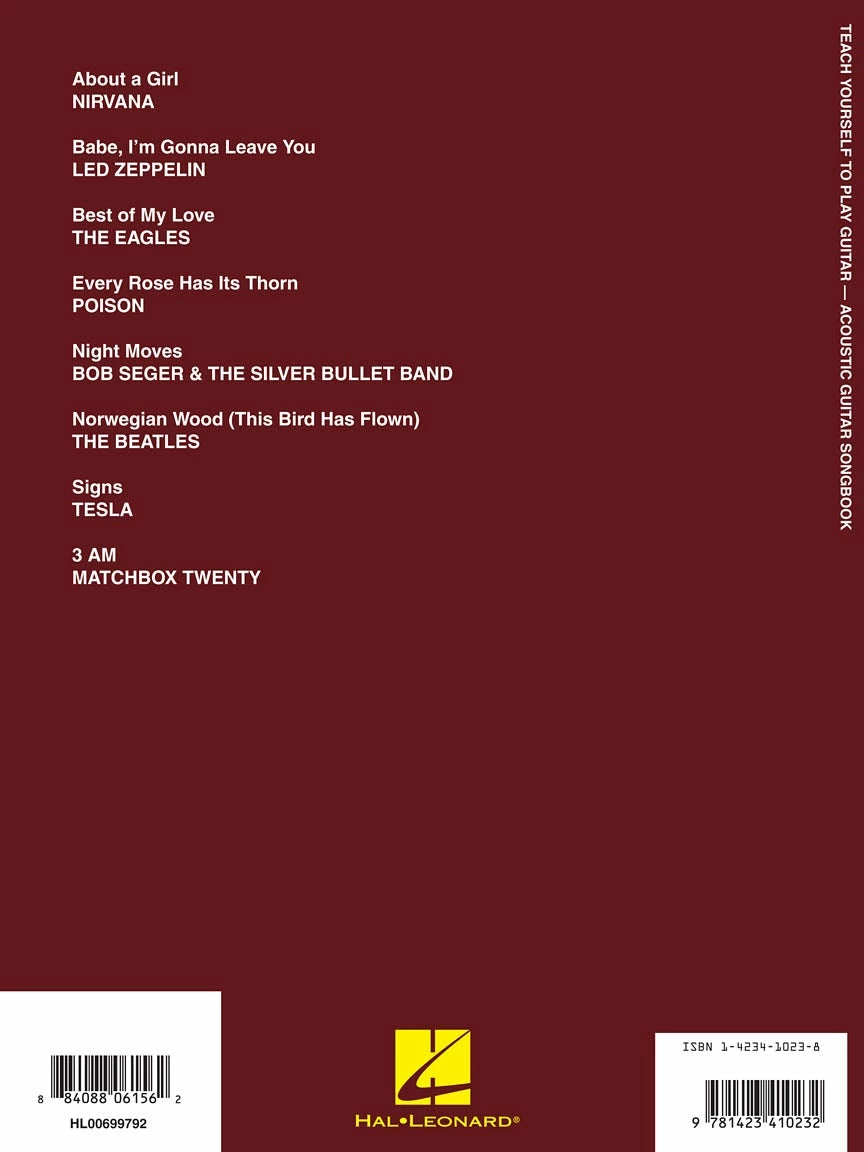 Learn how to play guitar using eight great acoustic songs and a CD featuring demo and play-along tracks. Songs: About a Girl โข Babe, I’m Gonna Leave You โข Best of My Love โข Every Rose Has Its Thorn โข Night Moves โข Norwegian Wood โข Signs โข 3 AM.