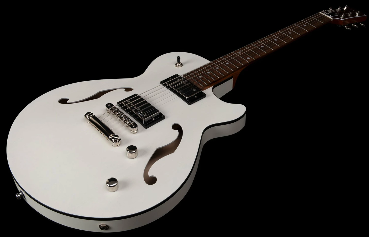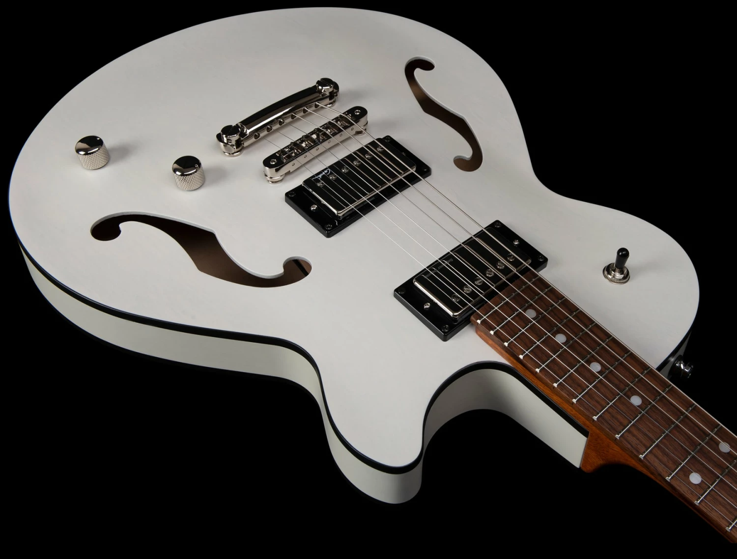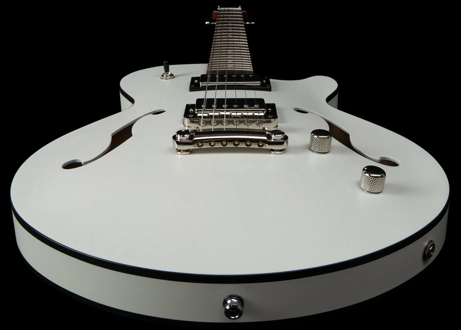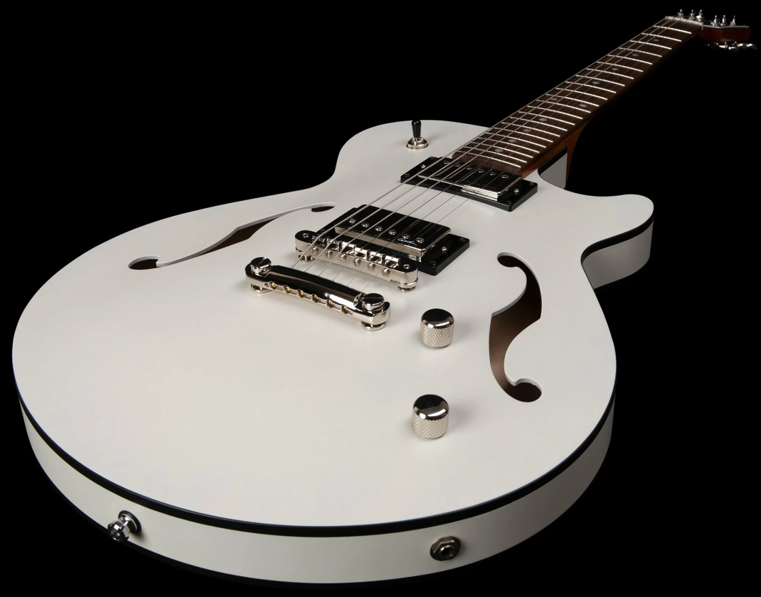 Presenting the Montreal Premiere HT Trans White-a vibrant and versatile guitar for jazz, blues and rock players alike! Much like other Montreal Premiere models, this guitar has an innovative and unique breathe-through carved cedar core to enable the body to resonate like no other guitar in its class. But, what makes this model unique is our newly-developed acoustic-inspired finish, which lends itself perfectly to this semi-hollow body design. Because the finish is thinner and more organic in nature-like you would find on a good acoustic guitar-it breathes more freely and offers even more sonic properties to the Montreal Premiere HT. While it is perfectly complemented by a classic Hard-tail bridge, this Montreal Premiere model really stands out with its pure Trans White finish!
