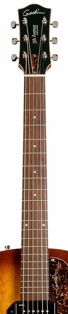 The Godin 5th Avenue brings you back to a time when the archtop acoustic guitar reigned supreme. With the soul of a 1950s archtop, the 5th Avenue is a true vintage spirit of yesterday with todayโs level of modern playability. With more projection & volume in the low/mids than traditional acoustic archtop guitars, the dynamically rich tone of the 5th Avenue makes this sophisticated instrument a dream to play but not a nightmare on your wallet. The Godin 5th Avenue now makes the dream of owning an affordable North American archtop a reality! From Alt-Country, Delta Blues, Slide, Jazz to Rock, the 5th Avenue can really deliver both acoustically and electrically. The Godin Kingpin P90 single-coil pickup delivers all that classic vintage tone with presence, clarity, and a little attitude thrown in for good measure!