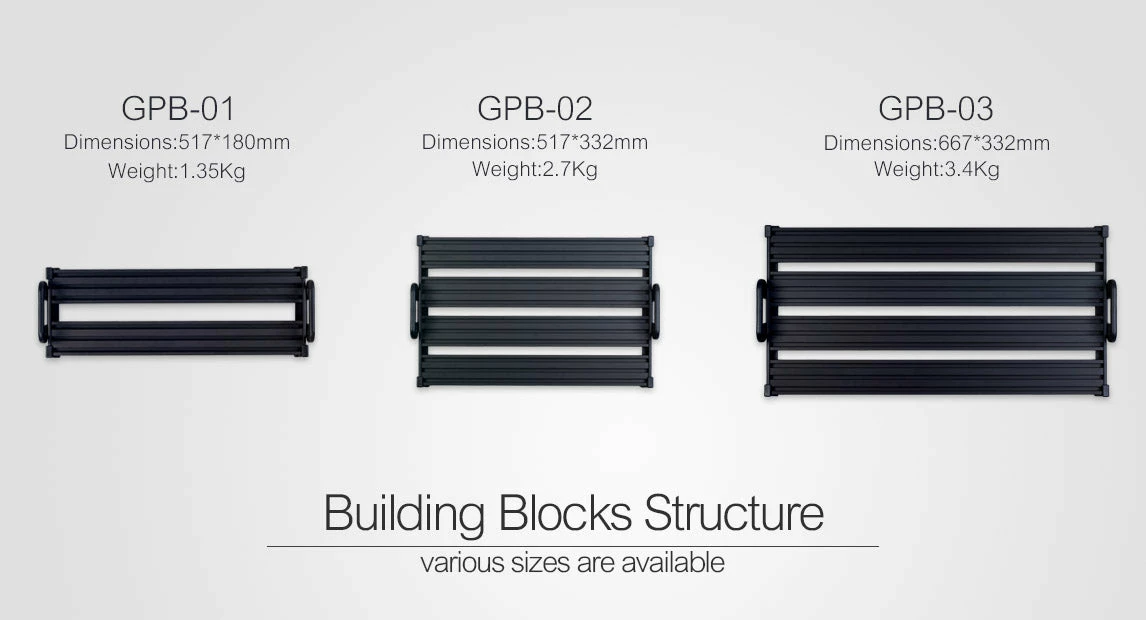 GPB pedal boards are innovative, human oriented and user-friendly, can fasten different shapes of pedals. With collapsible under-chassis, space-saving and portable, perfect for guitar performance. You can fix the pedals on the pedal boards quickly with the fixture blocks. Besides, the aluminum alloy structure ensures the maximum bearing capacity and impact resistance.