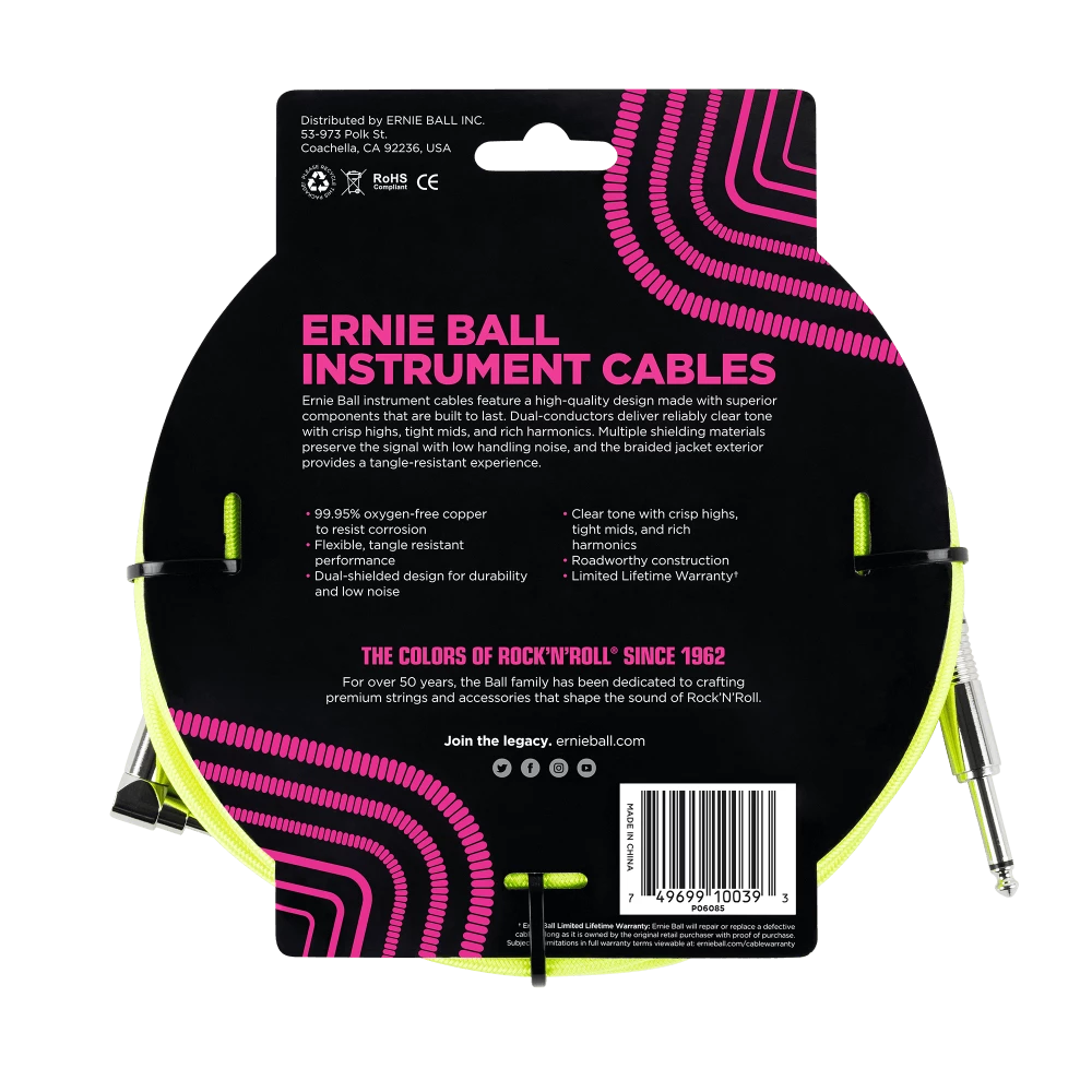 Discount ๐ Instrument Cables ERNIE BALL 18′ BRAIDED STRAIGHT / ANGLE INSTRUMENT CABLE NEON – YELLOW P06085 ๐ฅ