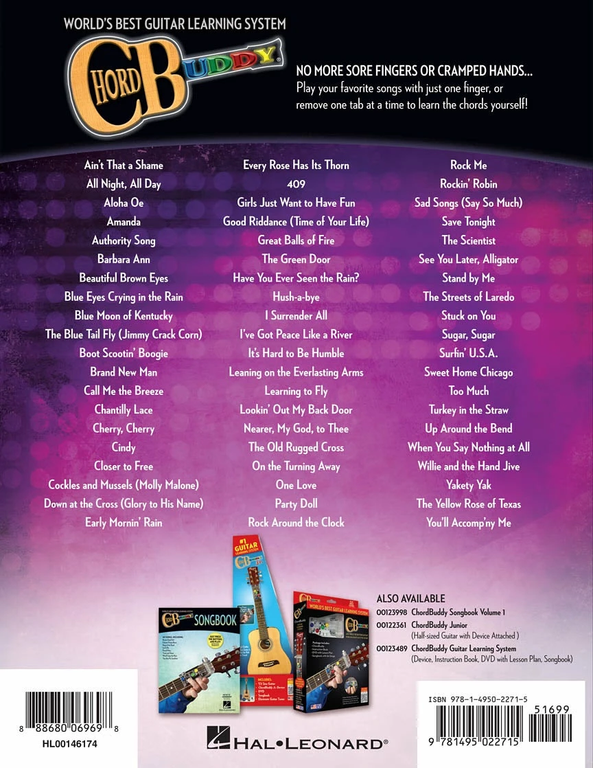 Each package includes the ChordBuddy as well as instructions on how to properly attach the device to your electric or acoustic guitar. The 2 Month lesson plan and companion digital DVD online access will have you playing popular songs in no time. The ChordBuddy Songbook 2 and shows you how to play them with and without the ChordBuddy. The color-coded ChordBuddy songbook includes many hit songs from the past and present including hits from country, bluegrass, gospel and rock-n-roll genres.