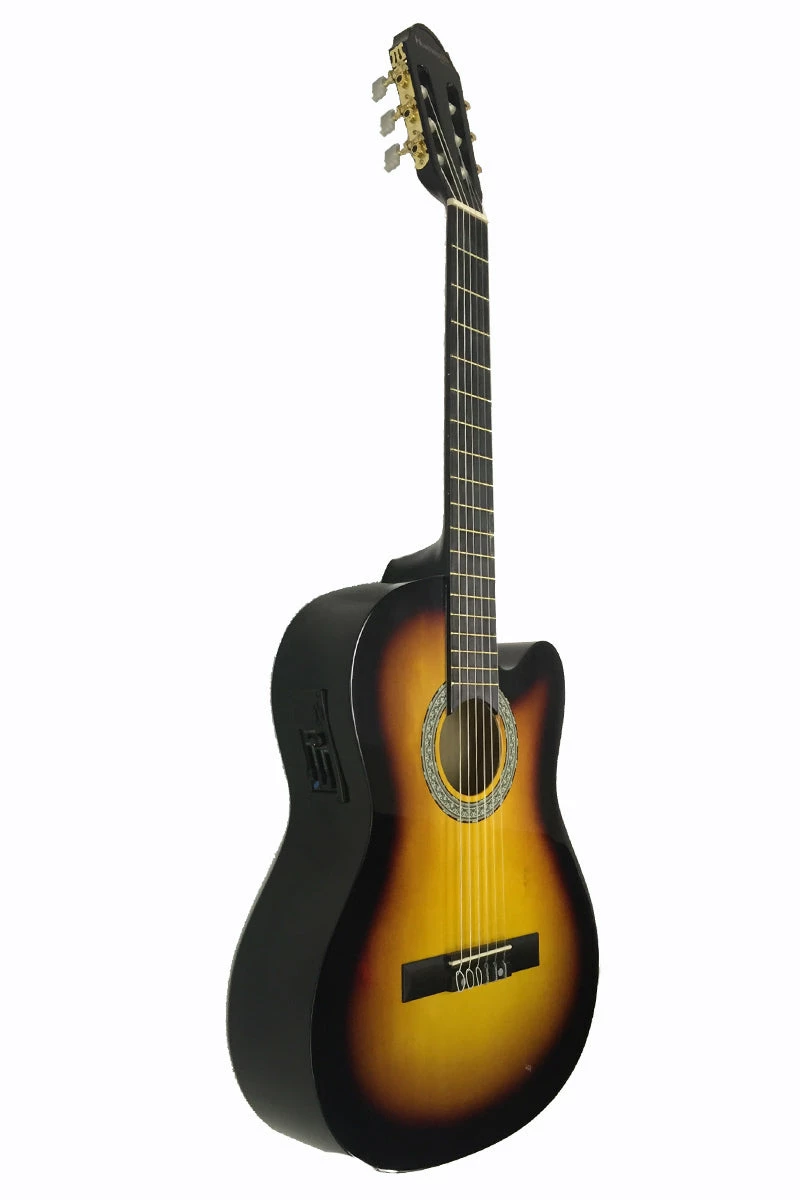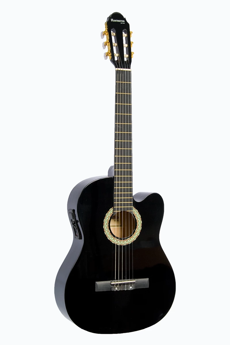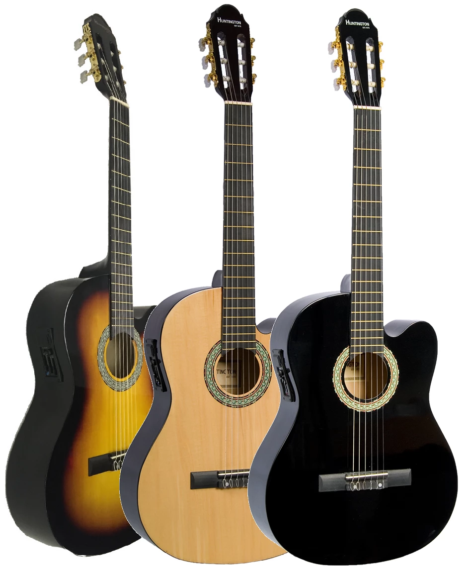 An excellent choice for any guitarist looking for amazing comfort, sound, and quality at a super low price! This Huntington is a full sized nylon string classical acoustic-electric guitar that features basswood, Linden, and Catalpa wood construction. ย It also features a high quality 3 band EQ system so you can plug it into an amp or PA system for amplified sound. This guitar has great sound and playability making it an ideal guitar for any musician!