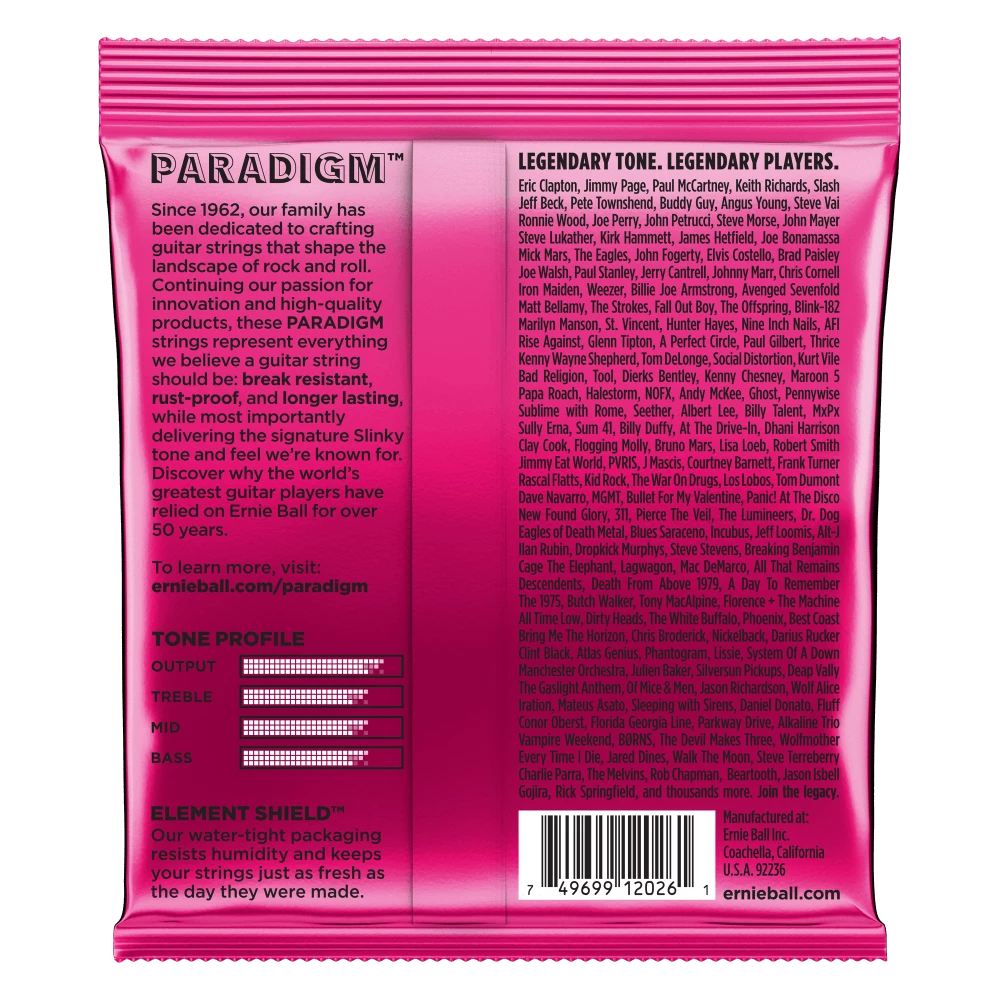 Ernie Ball Slinky Paradigm Electric guitar strings provide unprecedented strength and longer life while retaining 100% Slinky tone and feel. Ernie Ball’s industry leading ultra-high strength steel is included in both the wound and plain strings along with a patented reinforcement at the ball end twist of each plain string to provide superior tensile and fatigue strength for strings that lock into tune fast and hold up under the most stressful playing styles and conditions. The coupling of Ernie Ball’s Everlast nanotreatment with breakthrough plasma enhanced wrap wire provides added corrosion resistance and reduced accumulation of tone-robbing buildup and debris. Experience the first set of longer lasting strings that are worth playing with all benefits and no compromises. .009, .011, .016, .024w, .032, .042