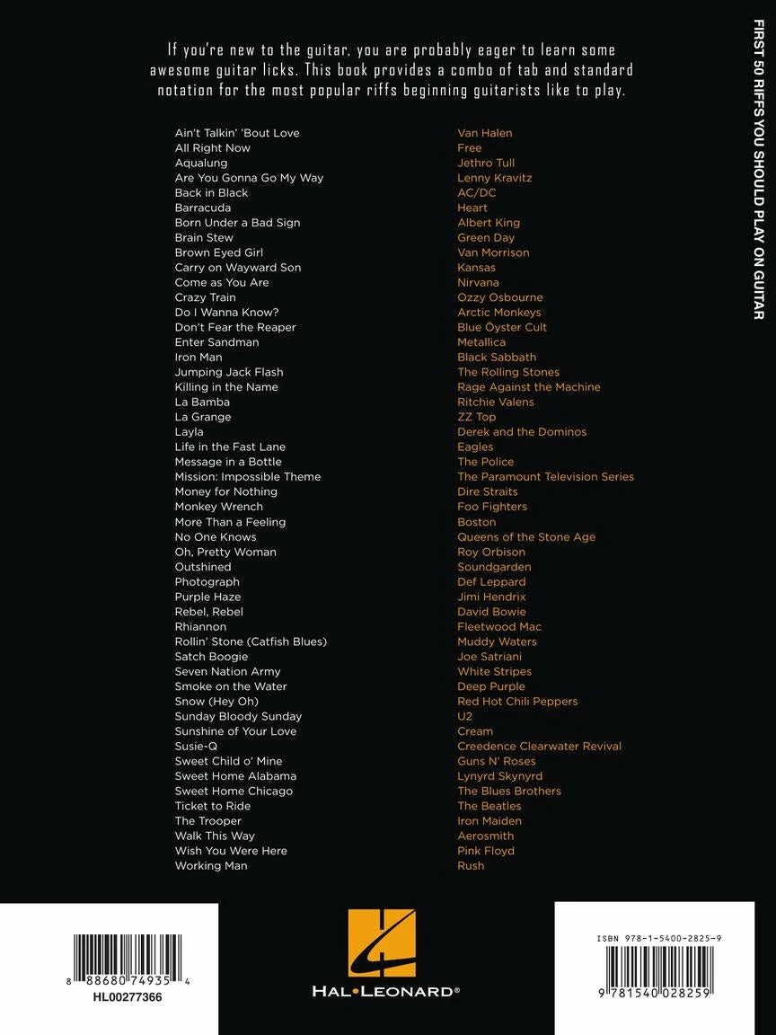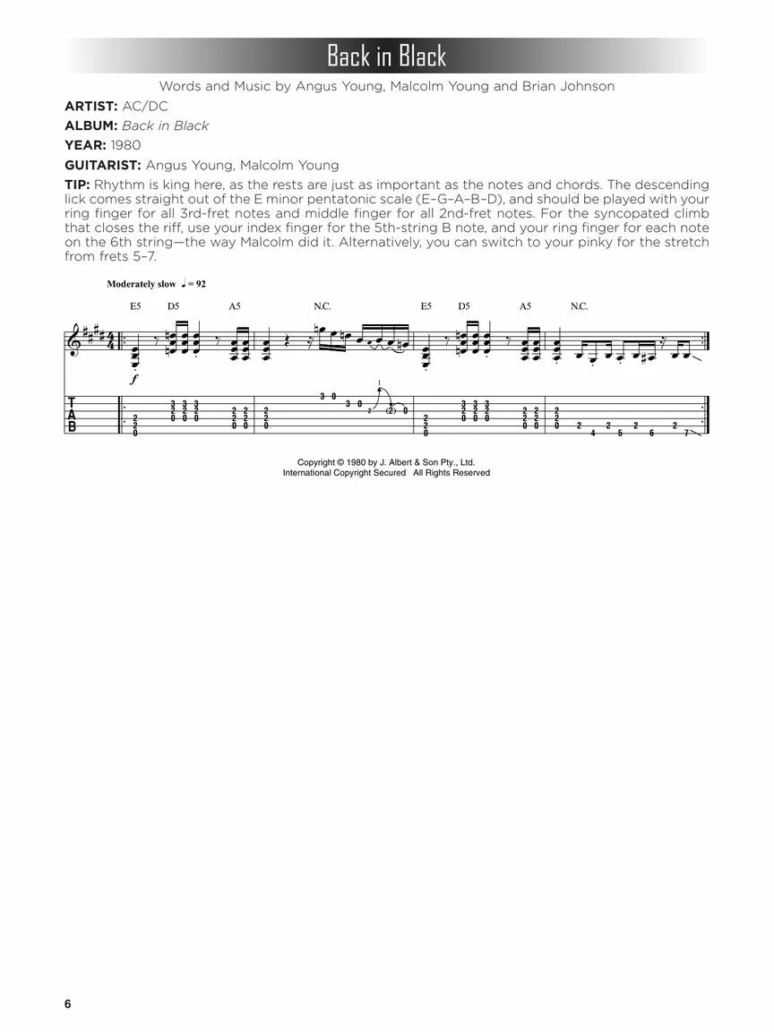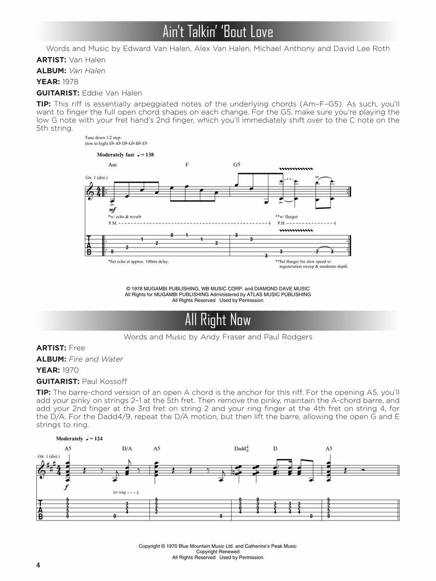 Now that you’ve had a few lessons you’re ready to start learning all the riffs that made you want to learn guitar in the first place! This amazing collection includes the iconic riffs from: All Right Now โข Back in Black โข Barracuda โข Carry on Wayward Son โข Come As You Are โข Crazy Train โข Don’t Fear the Reaper โข Enter Sandman โข Iron Man โข La Bamba โข La Grange โข Layla โข Message in a Bottle โข Mission: Impossible Theme โข Money for Nothing โข Monkey Wrench โข Oh, Pretty Woman โข Rebel, Rebel โข Rhiannon โข Seven Nation Army โข Smoke on the Water โข Sunday Bloody Sunday โข Sunshine of Your Love โข Sweet Home Alabama โข Ticket to Ride โข Walk This Way โข Working Man โข and more!