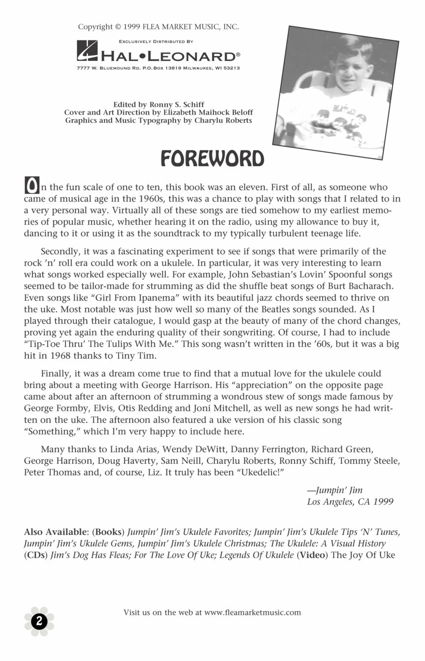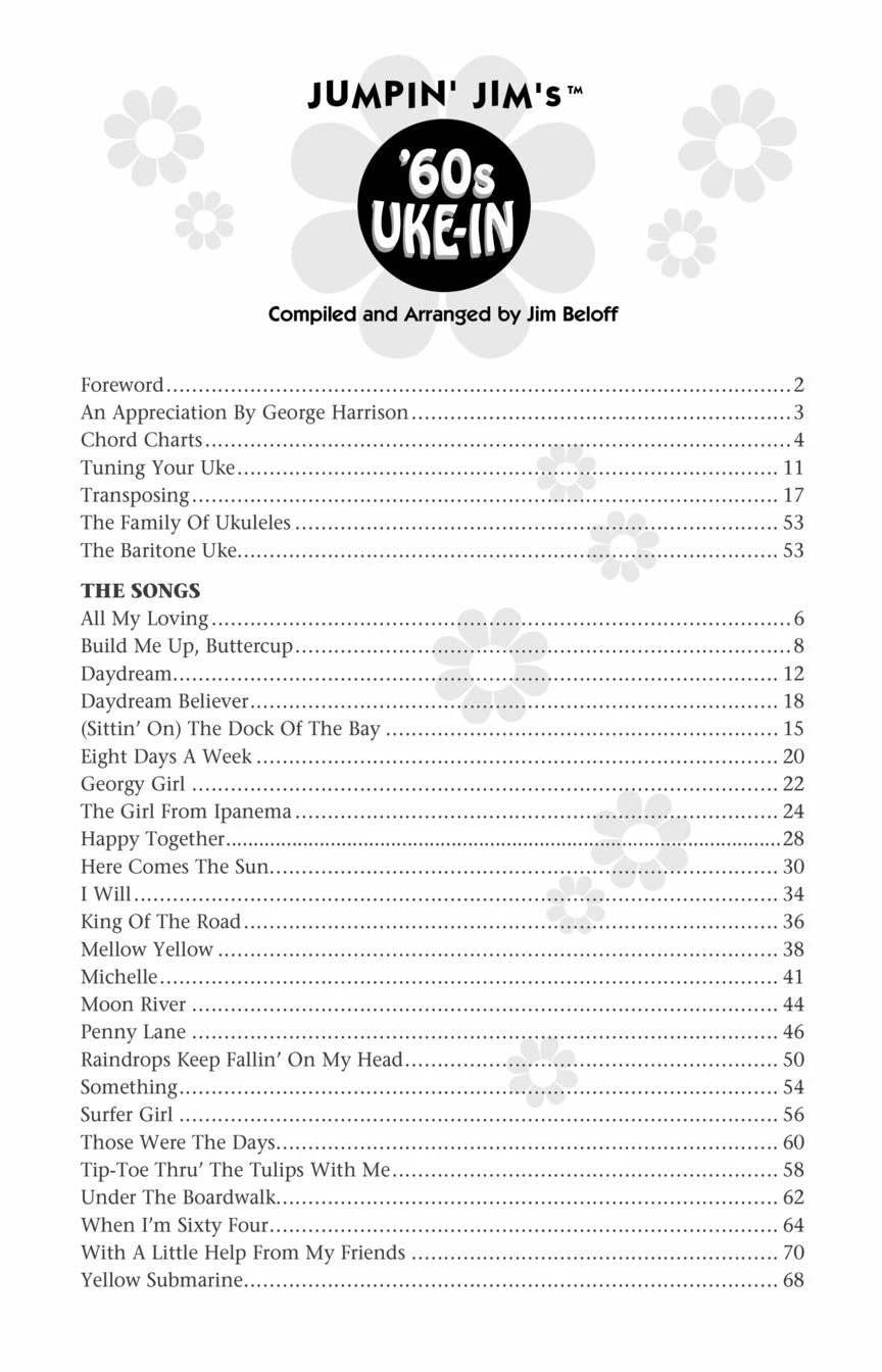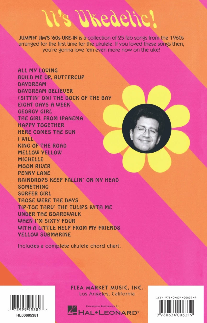 Jumpin’ Jim’s ’60s Uke-Inย is a collection of 25 fab songs from the 1960s arranged for the very first time for ukulele. It includes lots of big Beatles hits (All My Loving โข Eight Days a Week โข Here Comes the Sun โข Michelle โข Penny Lane โข Something โข When I’m Sixty-Four โข Yellow Submarine โข & more) as well as other classic ’60s tunes, such as: Daydream Believer โข Georgy Girl โข Happy Together โข Moon River โข Those Were the Days โข and more. Features an appreciation by George Harrison, a foreword by Jumpin’ Jim, a chord chart, and a groovy, psychedelic cover.