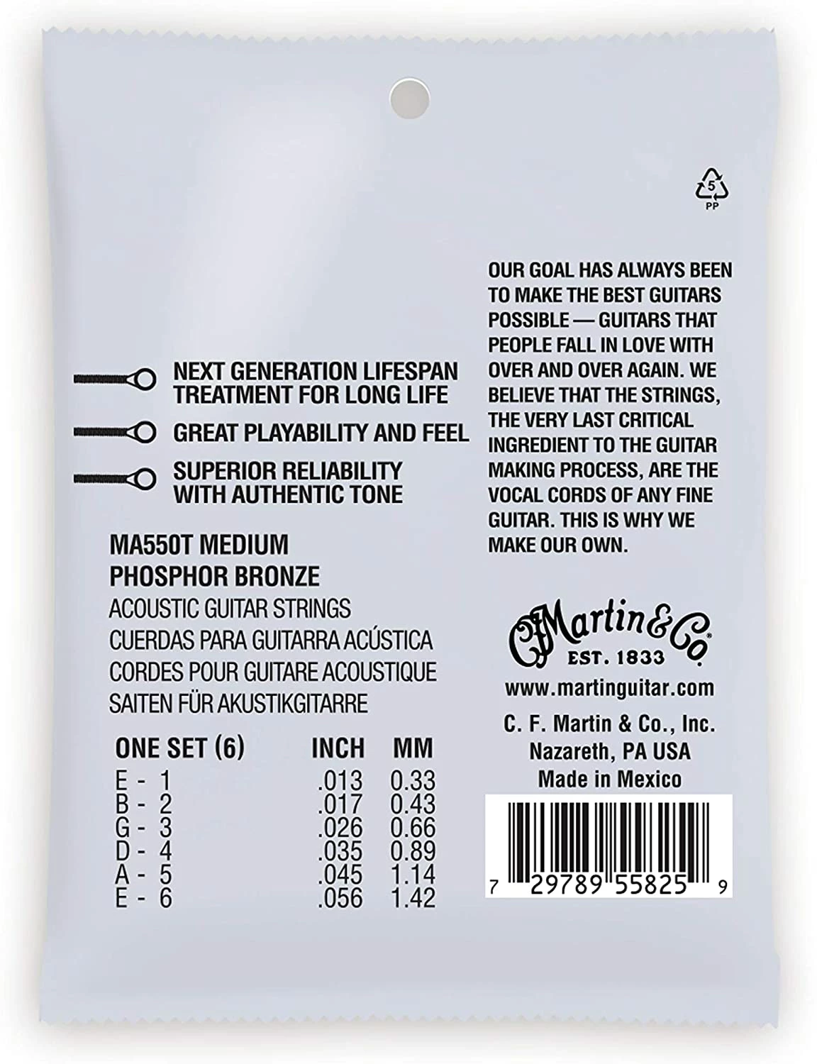 Martin® Authentic Acoustic® Superior Performance SP® strings feature higher tensile strength and tin-plated core wire on all six strings that enable a fuller and more balanced tone, quicker response and increased tuning stability. Our impeccable standards for acoustic guitar tone are embedded in our string design and precision manufacturing process. That’s why we make our own.