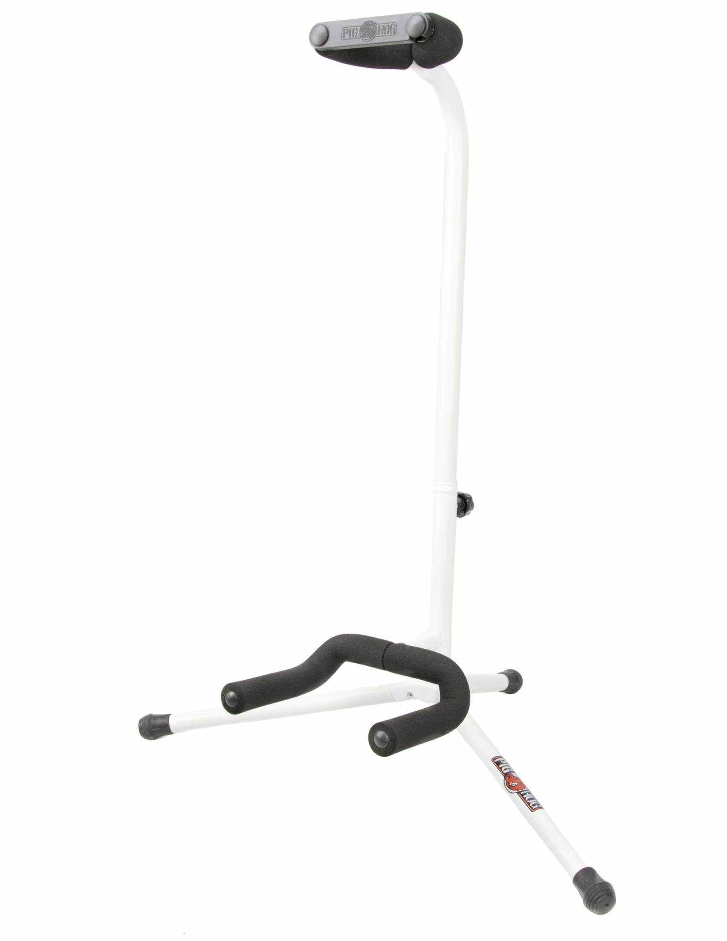 Pig Hog guitar stands are precisely overbuilt to stand up to the grueling tour conditions that make other stands squeal. These tour-worthy stands feature extra fat padding, and all contact points are finished with non-reactive foam that is safe for most lacquers and finishes. The height adjustable center post can be set easily for different guitar types. A robust locking bar secures your guitar’s neck to the stand, while remaining easy to operate with one hand. The sturdy steel tripod base features rubber feet for balance and stability, and collapses down easily for storage or transport. And with Pig Hog’s “no question” lifetime guarantee, we’ve got your back for the life of the stand. Don’t settle for those fat-free stands. Grab hold of a Pig Hog!