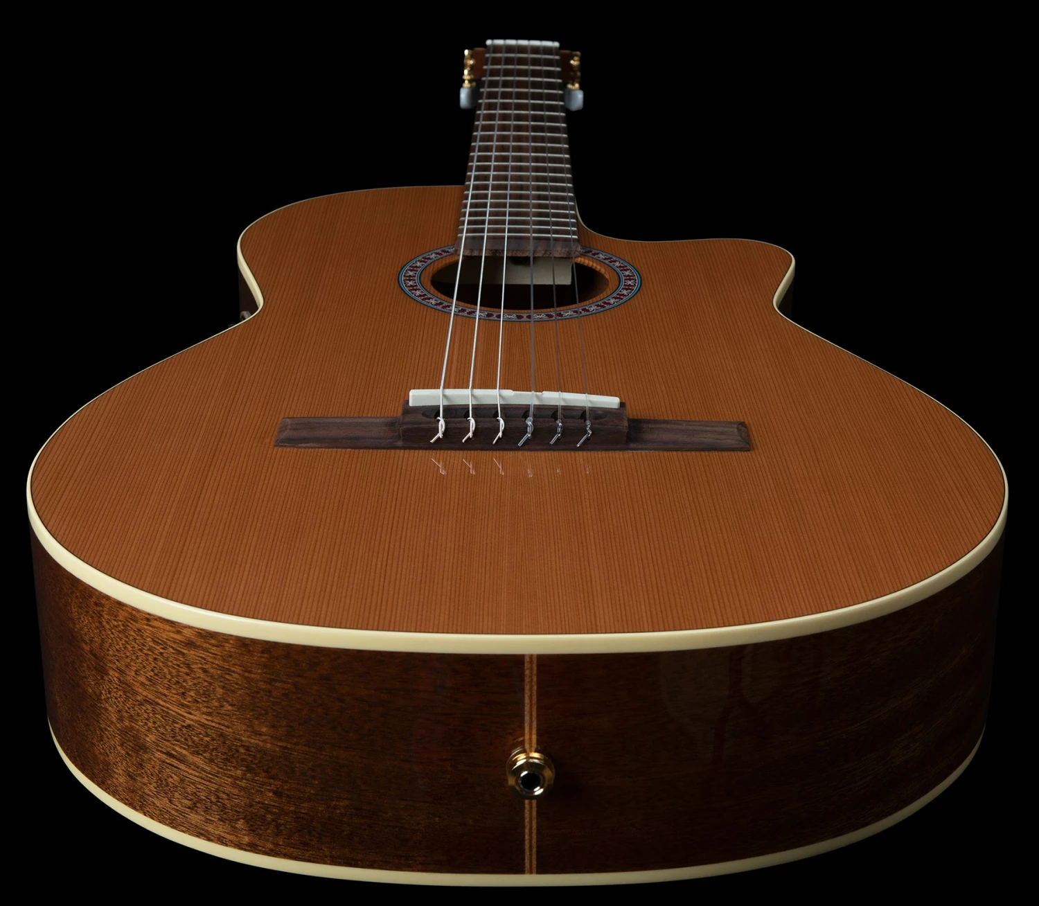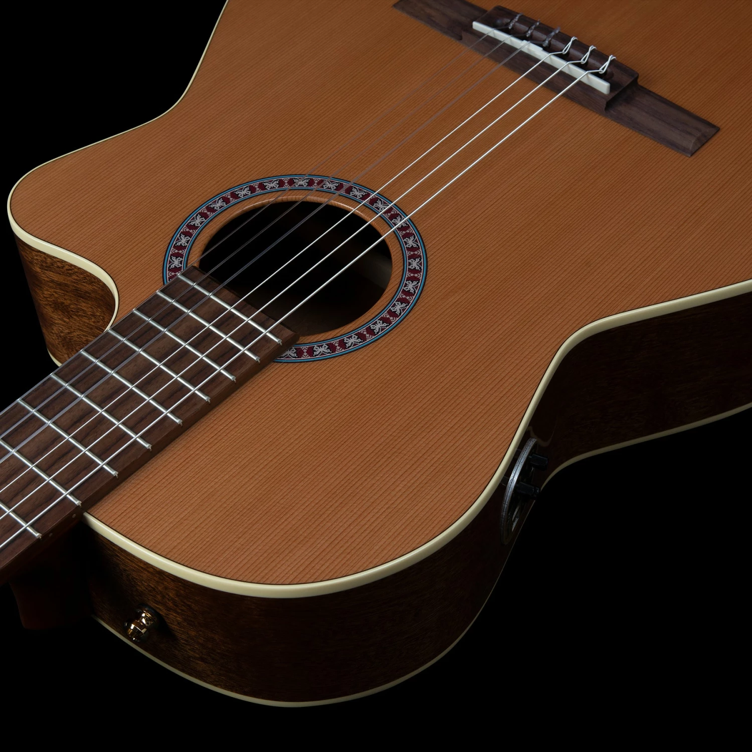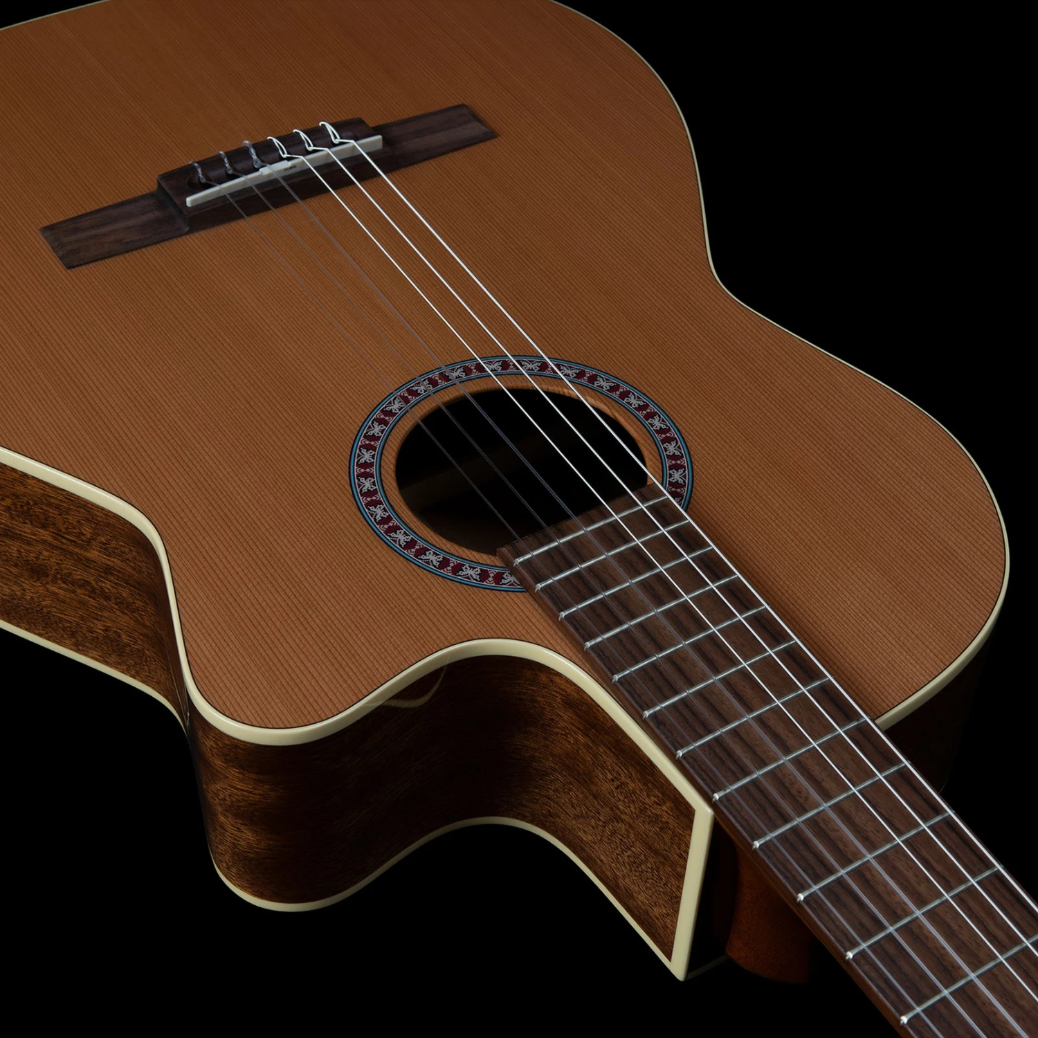 The Solid mahogany back and sides let your notes ring out with full-bodied sustain that will resonate not only in sound but with any player looking into classical nylon stringed guitars. A high-gloss custom polished finish makes sure that the instrument will stand out and shine, while the rosewood fingerboard feels great as you slide up and down the mahogany neck. And with the guitar’s cutaway, it’s easy to play higher notes. Those looking for an excellent mid-level classical guitar need look no further than the Concert CW.