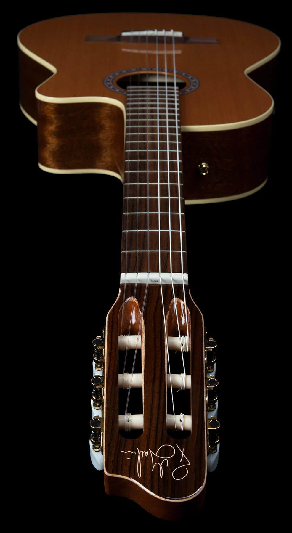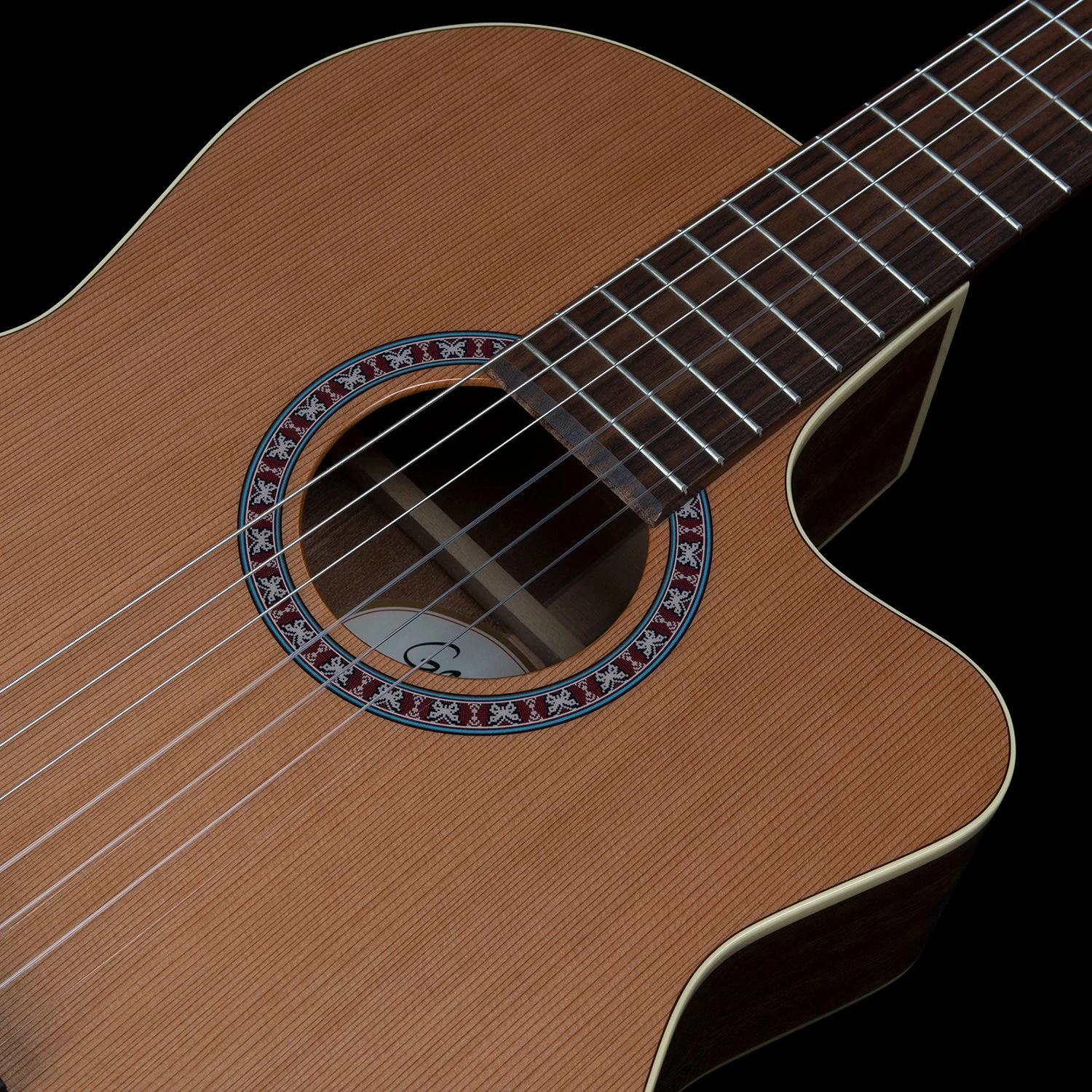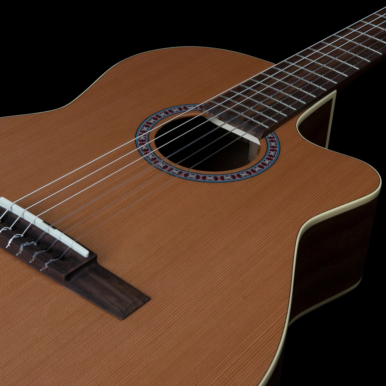 The Solid mahogany back and sides let your notes ring out with full-bodied sustain that will resonate not only in sound but with any player looking into classical nylon stringed guitars. A high-gloss custom polished finish makes sure that the instrument will stand out and shine, while the rosewood fingerboard feels great as you slide up and down the mahogany neck. And with the guitar’s cutaway, it’s easy to play higher notes. Those looking for an excellent mid-level classical guitar need look no further than the Concert CW.