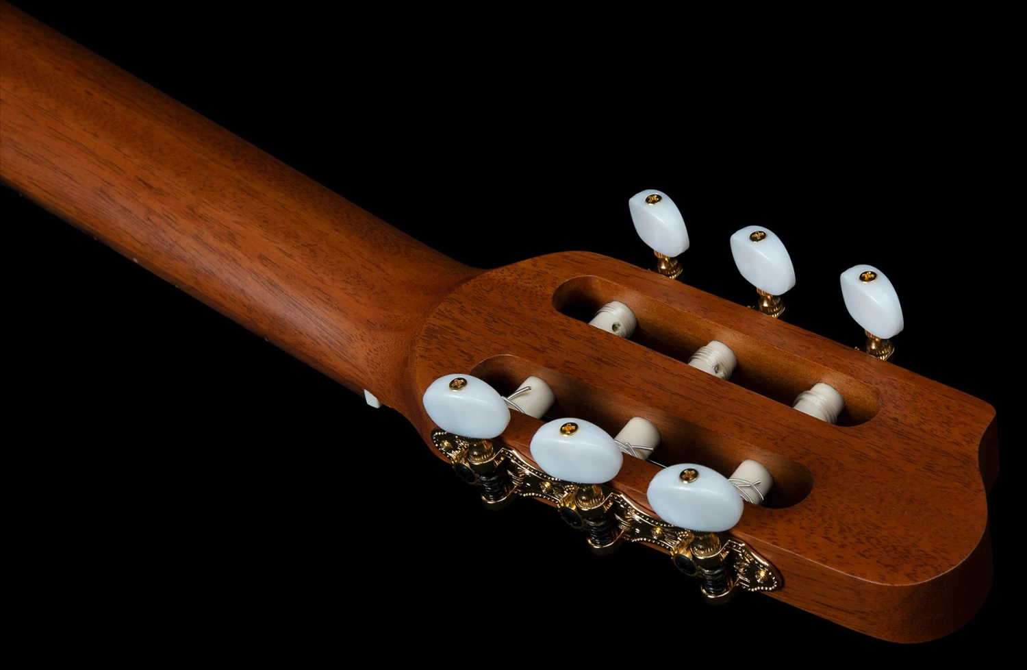 Classical guitars of the past have typically been made with thick neck dimensions; while this enhanced the neck’s stability, it often made playing more difficult. Because of this, special attention was directed to the neck design of these guitars. Neck width and string spacing conform to classical standards, but the truss rod system allows the profile of the neck to be reduced which produces a neck of extraordinary comfort, while increasing its stability. These necks are carved from Honduras mahogany.