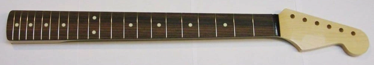 High Quality Strat Vintage Style Neck 21 vintage frets Maple neck gloss finished Rosewood fingerboard 7.25″ Radius Nut width 42mm Heel width 56.2mm Tuning Peg Hole Diameter 8.2mm Truss Rod adjustment at heel These necks are supplied without nut, and require the curved bottom Fender type. We keep a selection of plastic, bone, GraphTec Tusq under ‘neck parts’ These are made of the highest quality wood. No two necks are exactly the same so grains may differ slightly from the photos.